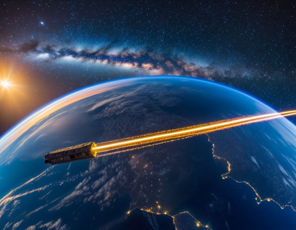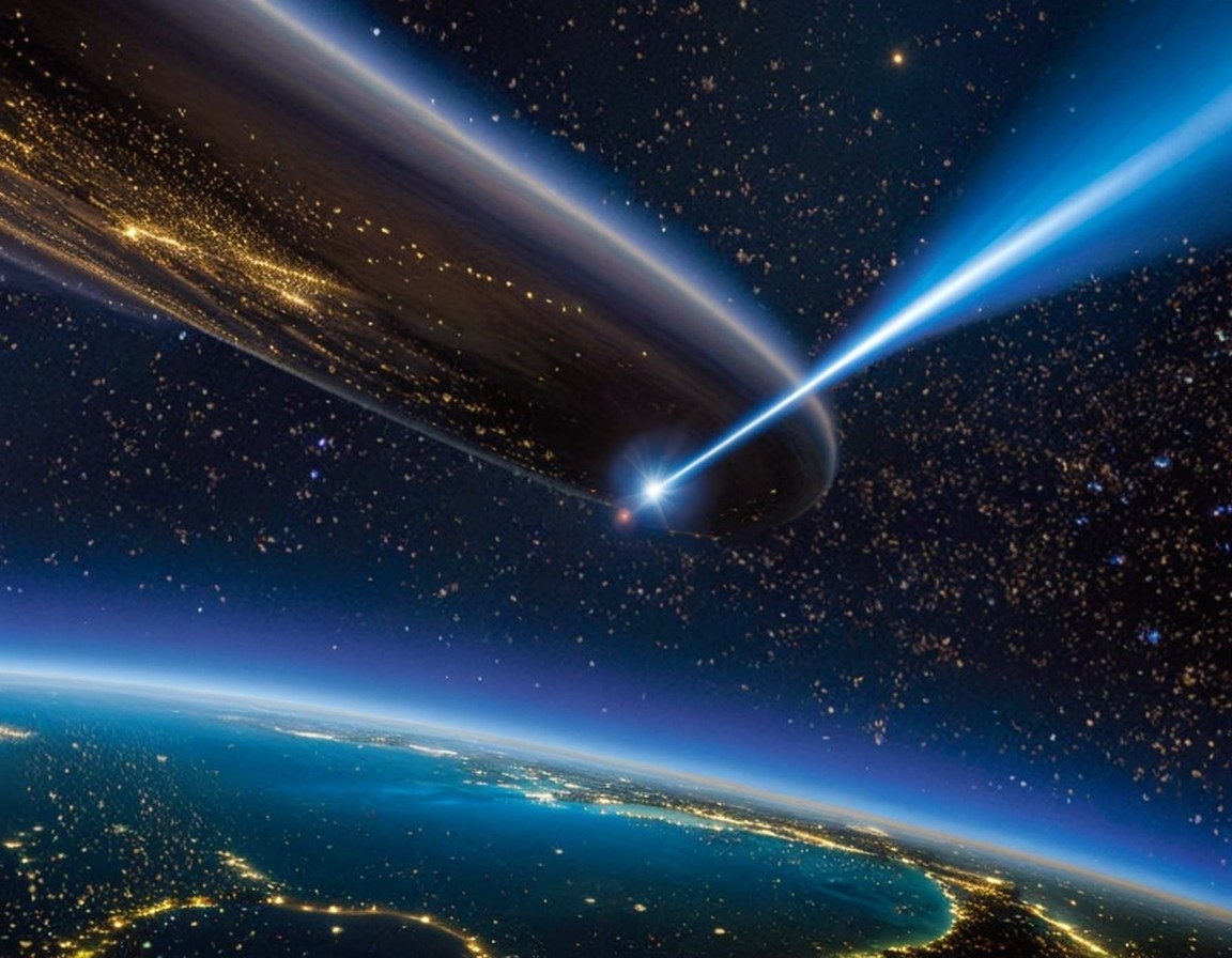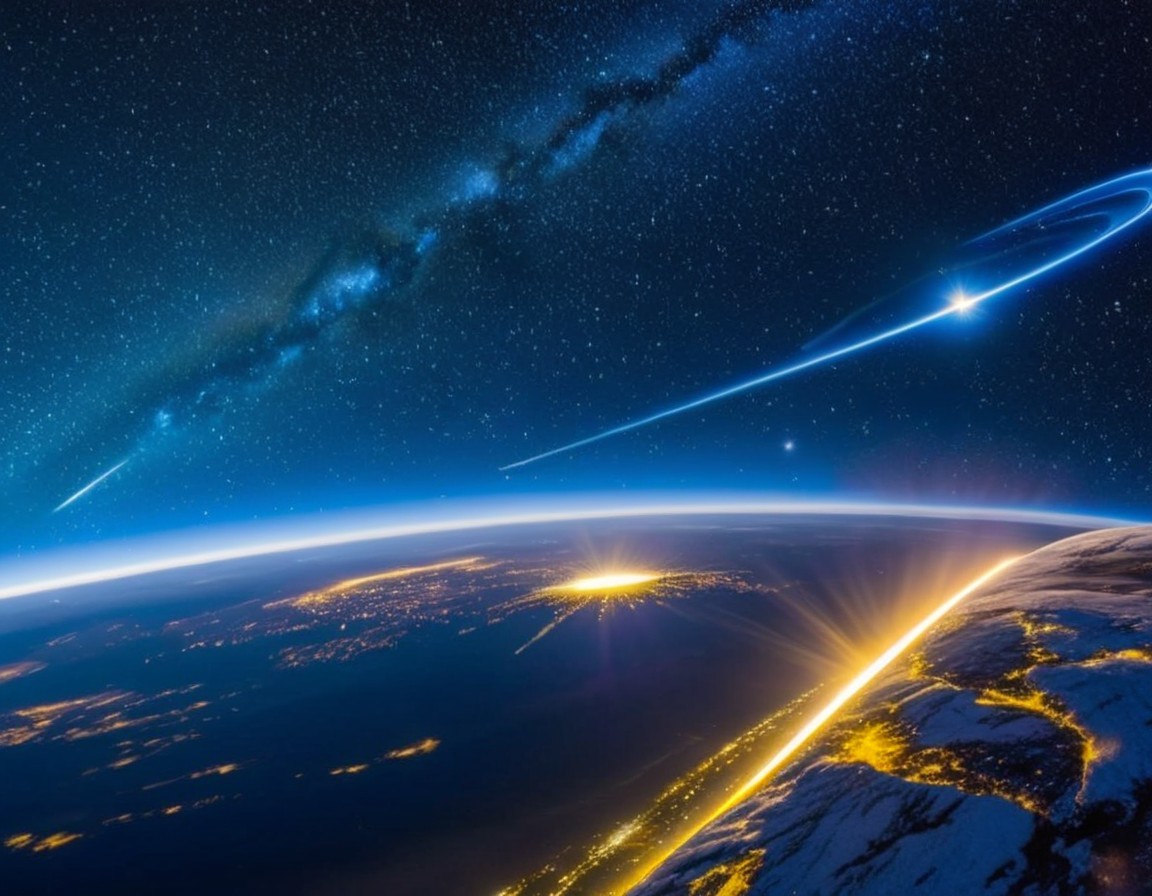 A stunning cosmic view of the Earth's horizon at night with city lights, shooting stars, and a galaxy visible in the sky.