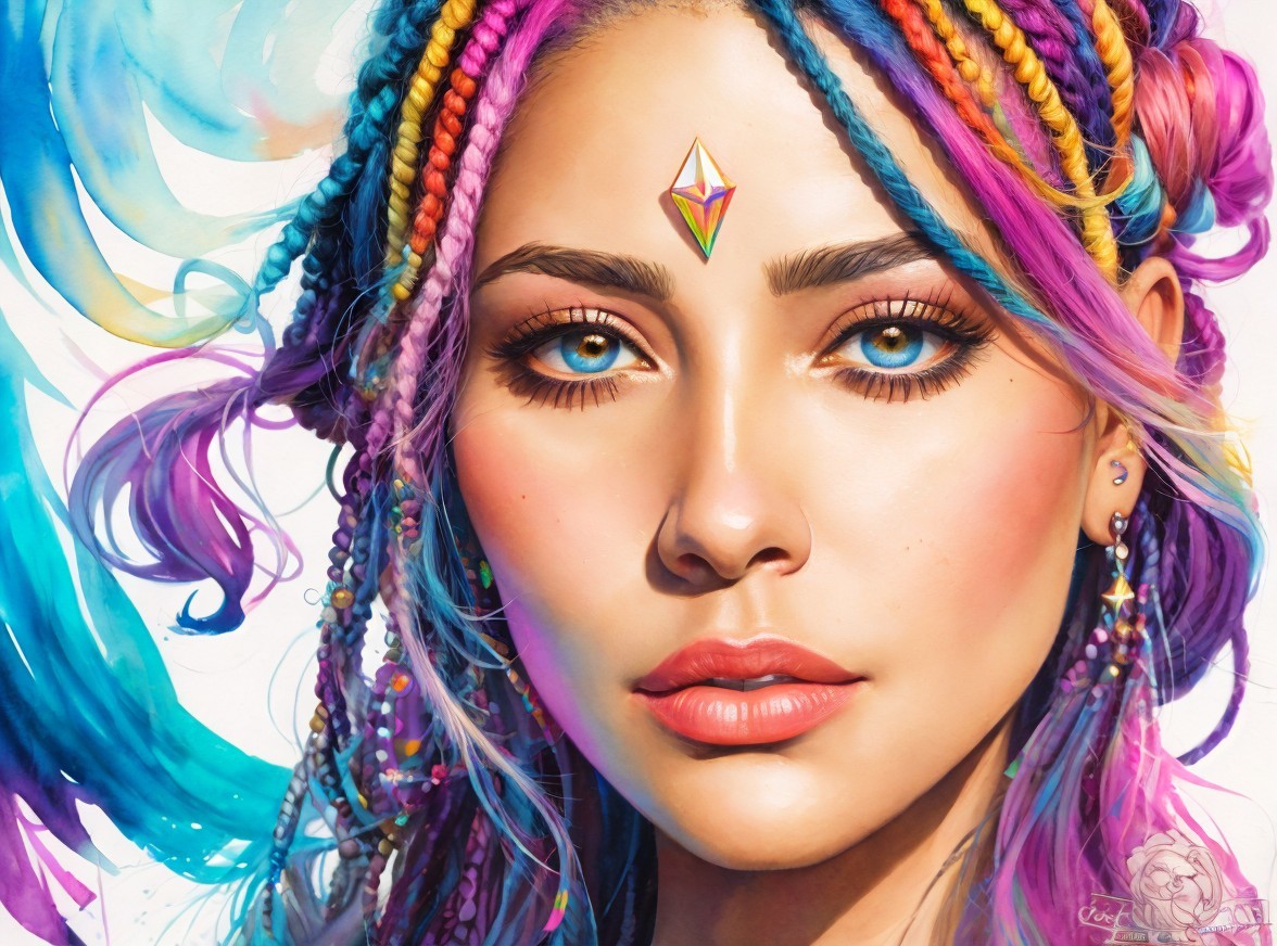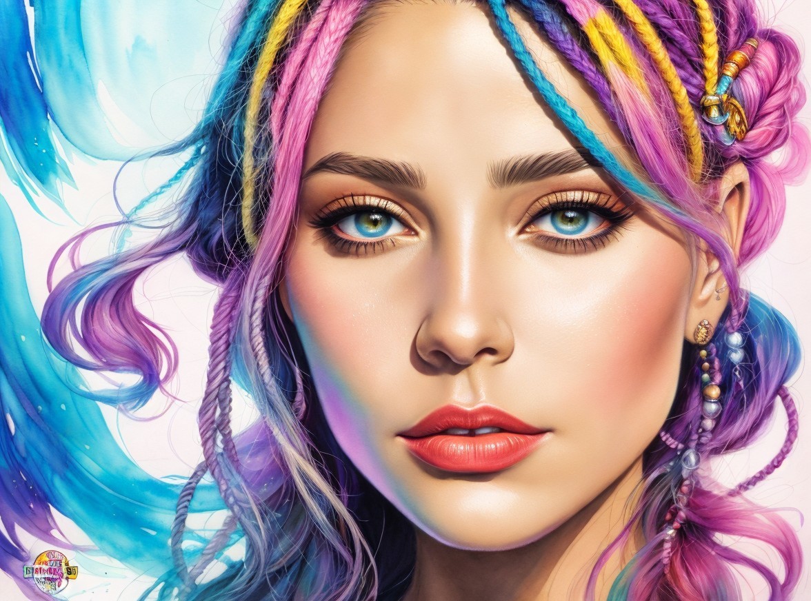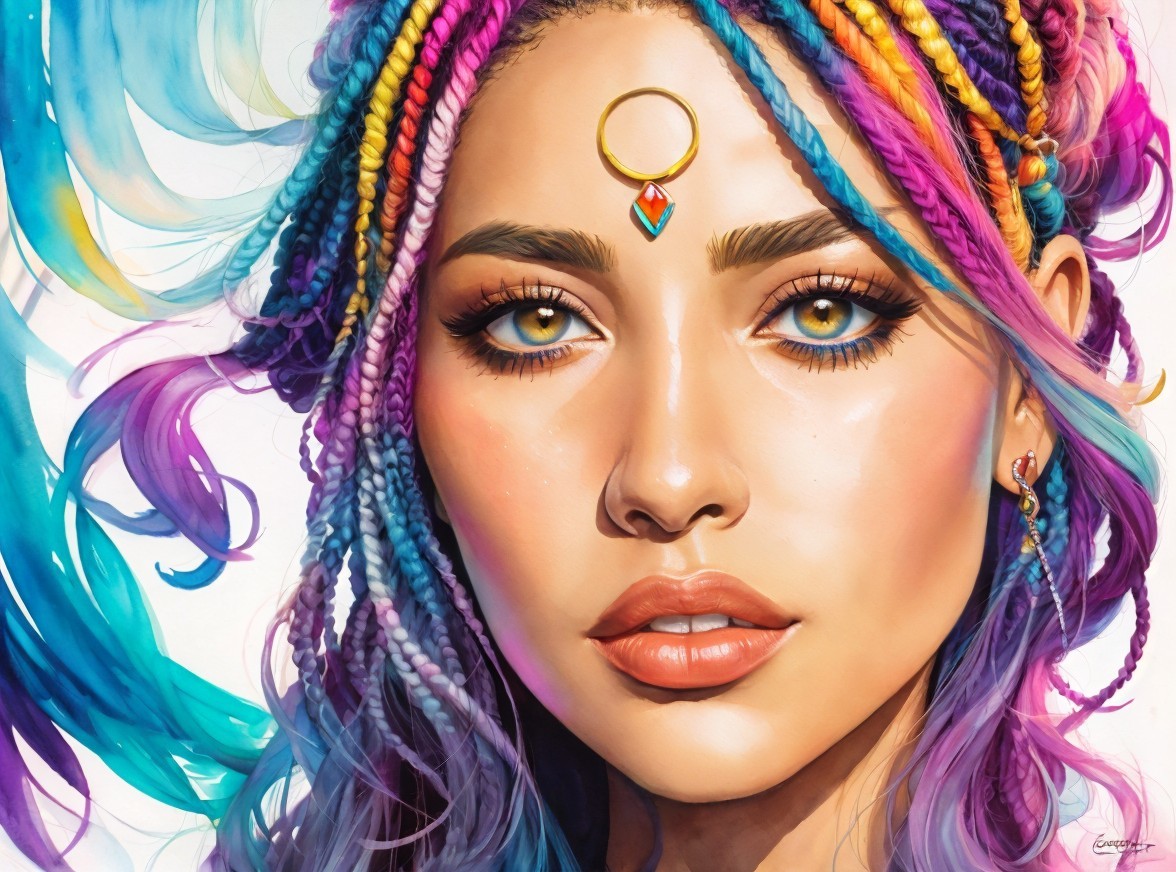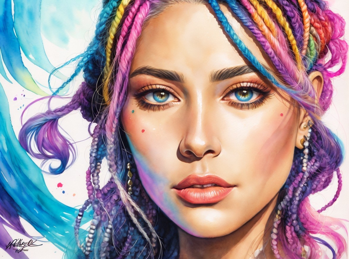 Portraiture without denial and delusion and defiance, close-up, headshot, colorful lineage illustration, comic book art in style of marvel comics, serene, Watercolor and ink illustration, Beautiful headshot with aura, dreadlocks, chibli style of Georgia O'Keefe and Overton Loyd, coherent, fauvistic, Portraiture in style of tomasz alen kopera, peter mohrbacher, joseph christian leyendecker, frank frazetta, Overton Loyd, Geof Darrow, susan macdowell eakins, action pose, triadic color scheme blue red beige, fantastical dystopian background, gothical psychpomp, grunge, 3d effects 1.8, ambient occlusion 1.5, anisotropic filtering 1.2,, raytraced shadows 1.2, wicked eyes, 3d effects 1.8, detailed textures, chipped, dynamic lighting 1.7, (( high coloring 1.9, bokeh effects, (muted colors of beige and bkue, contrast colors, limited palette,) stylized illustration), complexion, plasticity 1.4, intricate ornamental details 1.9) 11:5), digital stylized illustration, watercolor and ink intertwined with anthotype print, grunge, Stylized watercolor details, stunning, intricate ,meticulously, flamboyant coloring, detailed close-up portrait, stylized face, watery alcoholic painture with dots and flares and splashes, soft rounded edges, back-lit, wavery paint, style of paint dripping technique, wet on wet painting, hues, , chiaroscuro lighting, ambient occlusion 1.5, shadow mapping 1.3, 3d effects 1.8, intricate stylized hairstyle, brightness 1.7, stylized zentangle lines, abstract, coherent, otherworldly psychpomp, occult, Anglo gothic 1.9, auracore, high coloring 1.9, mosscore 1.7, traumacore 1.2, retrofuturistic details of ornate, maximalism, radiance, brightness 1.2, splashing particles, dreamy, tints of abstract art nouveau illustration and Surrealism, bokeh effects 1.8, shadow mapping 1.3,