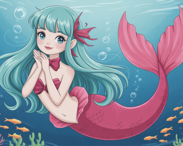 A charming anime girl in a whimsical lunar-themed nightgown gracefully floats underwater, surrounded by shimmering fish and glowing aquatic plants, creating a serene and magical atmosphere.