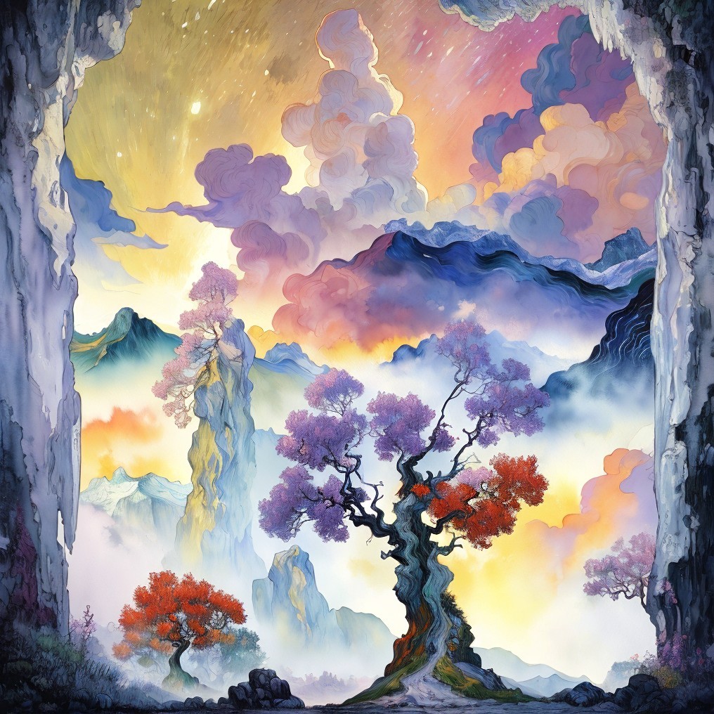 + Prompt:anthropomorphic landscapes AND fine art paper AND archival pigment ink AND Graphic novel AND Mind bending AND neo-noir AND Retro Illustration AND Still Life Watercolor
