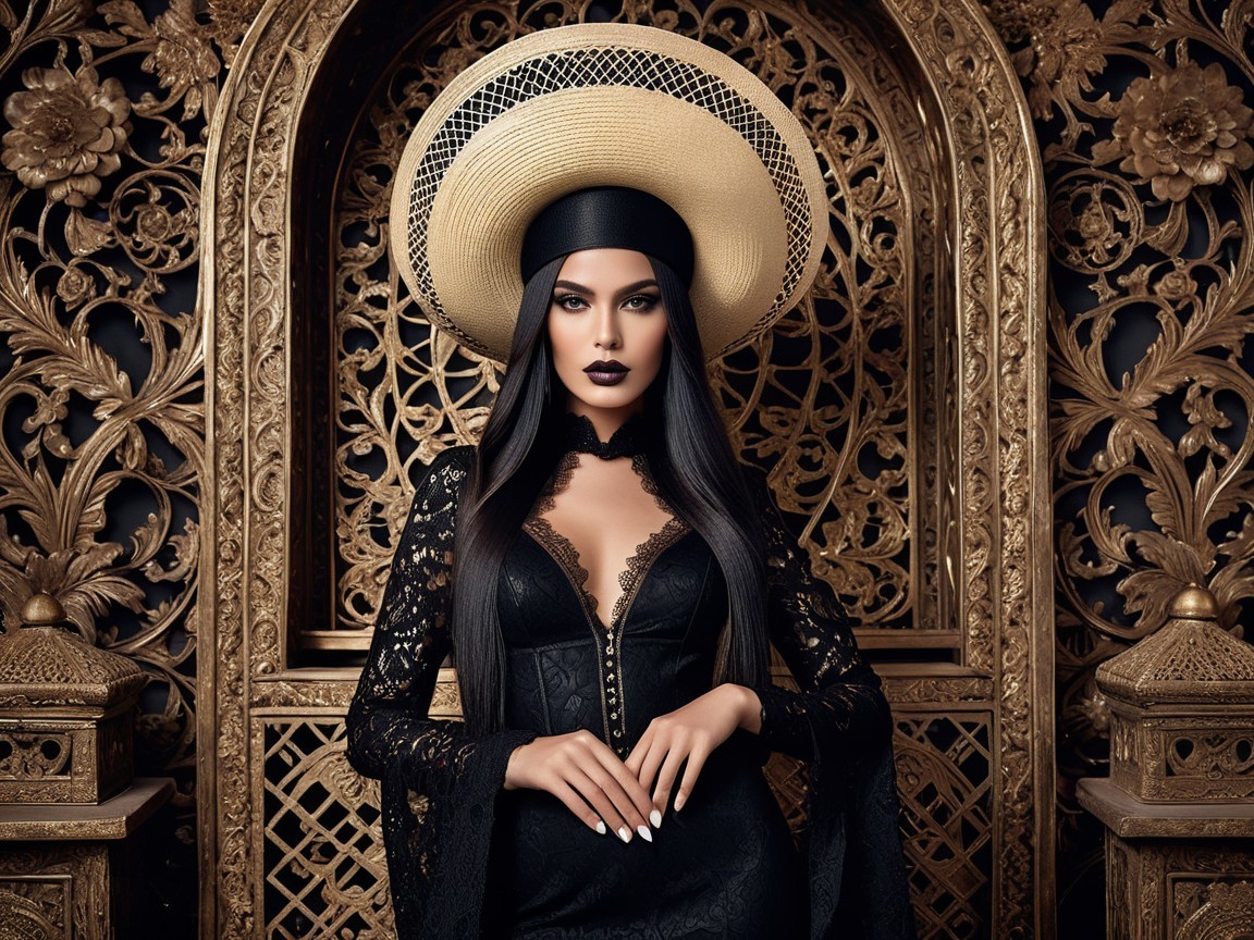 A striking woman in a black lace dress and wide-brimmed straw hat sits confidently on an ornate throne. The intricate gold background enhances her bold, dark makeup and elegant poise.