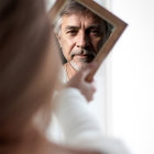 A man gazes into a diamond-shaped mirror, reflecting a man's face, who has silver hair and an intense expression. The setting is bright, creating a captivating, intimate scene.