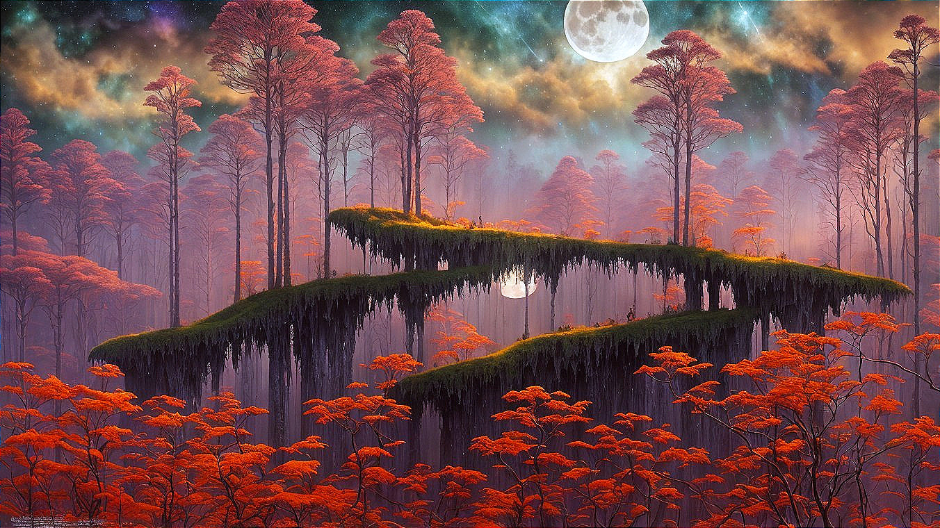 Prompt: Full moon over radiant forest. By James Gurney, Tim Burton and Ferdinand Knab. symbolic mixed media intricate dystopian piece. dark starry sky.