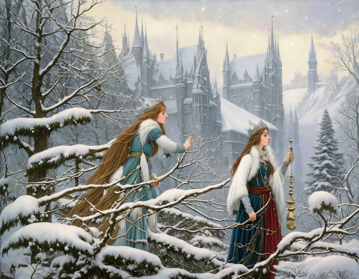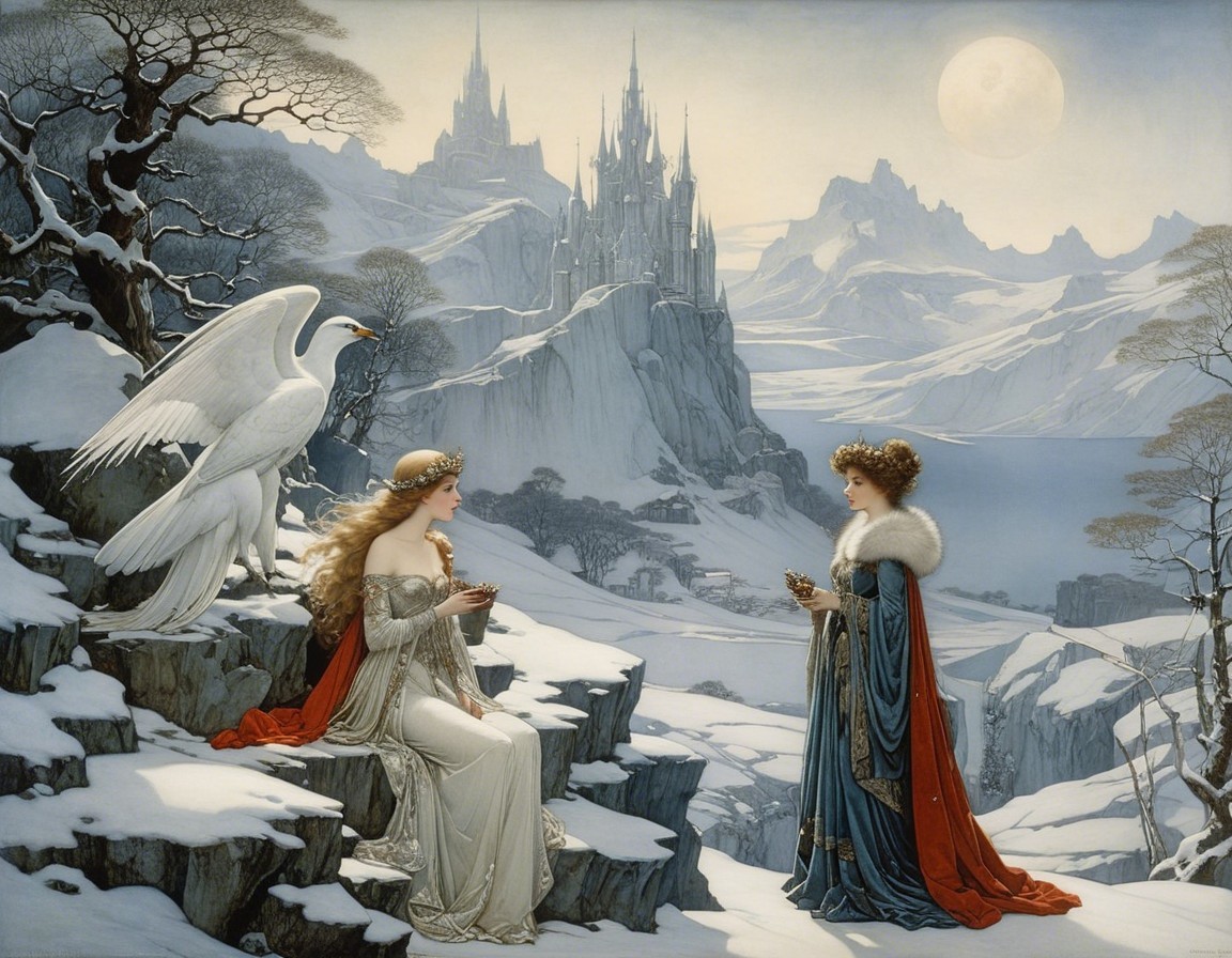 Two elegantly dressed figures stand in a snowy landscape, surrounded by majestic mountains and evergreen trees. A glowing tree and a full moon illuminate the serene winter scene.