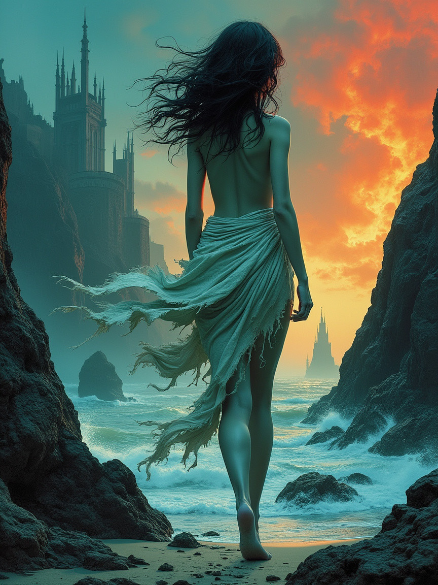 A silhouetted figure stands at the edge of a rocky shore, draped in flowing fabric. In the background, a dramatic sunset illuminates a distant castle and swirling clouds, creating an ethereal atmosphere.