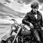 The image features a young man in a vintage police uniform and leather jacket, leaning on a classic motorcycle against an old-town backdrop with dramatic clouds and palm trees.