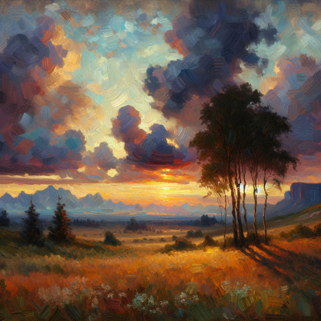 Serene Sunset Landscape with Rolling Hills and Farmhouse