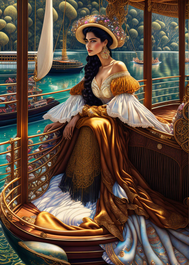 Beautiful woman sitting in a gorgeous riverboat floating down a tropical river
