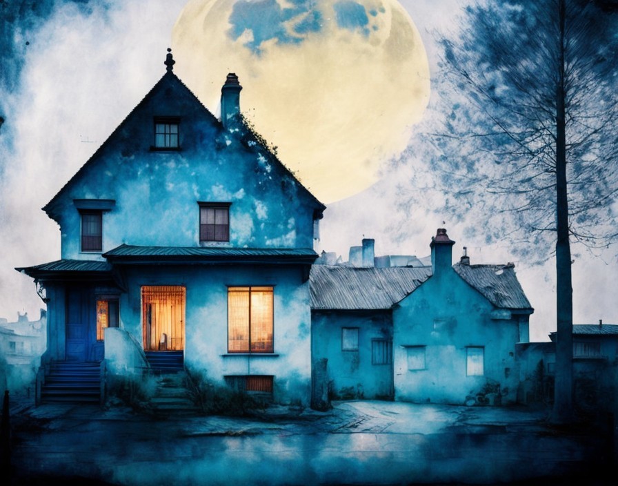 Prompt: single integrated image, blue moon, media blend of colored ink and photography (by Floris Arntzenius:1.6) (in style of Ando Fuchs:0.8) with (ink lines overdrawn in style of Ellen Gallagher:2.4), low angle, aquatint glaze, landscape format full width single image