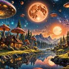 A whimsical fantasy landscape featuring oversized, vibrant mushrooms and ethereal glowing flora. In the background, two moons—one full and bright—illuminate a serene lake surrounded by majestic mountains and dense evergreen trees. A cozy, charming cottage sits near the water's edge, with warm light spilling from its windows. The sky is filled with twinkling stars, and a surreal twilight ambiance enhances the magical feel of the scene. The colors are rich and saturated, creating a dreamlike atmosphere.
