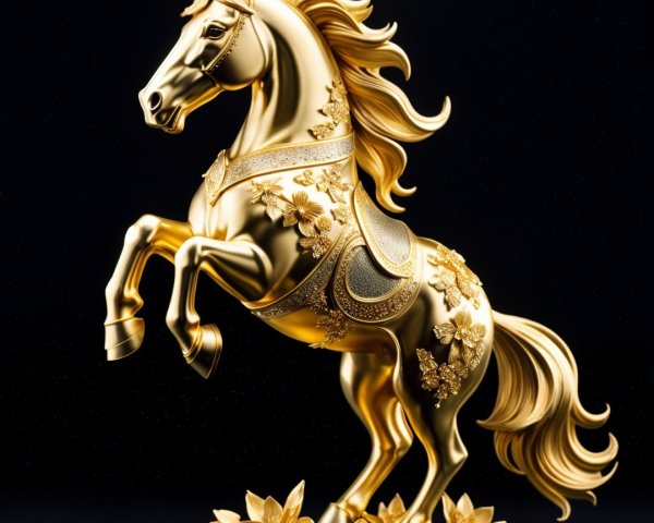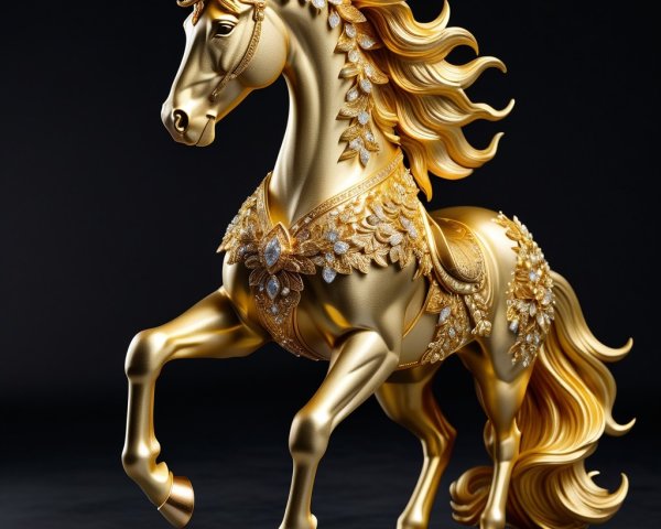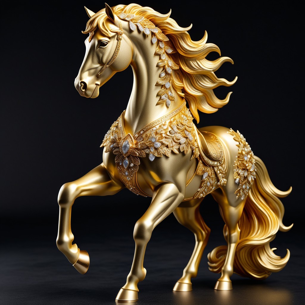 This stunning sculpture features a majestic golden horse adorned with intricate floral designs and sparkling gems, showcasing elegance and craftsmanship against a dark backdrop.