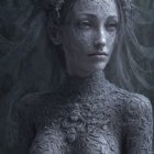 A serene, ethereal figure emerges from a dark, textured background. Her body resembles intricate coral or stone, and her hair flows like tendrils, creating a mystical and otherworldly atmosphere.