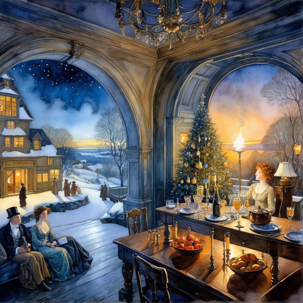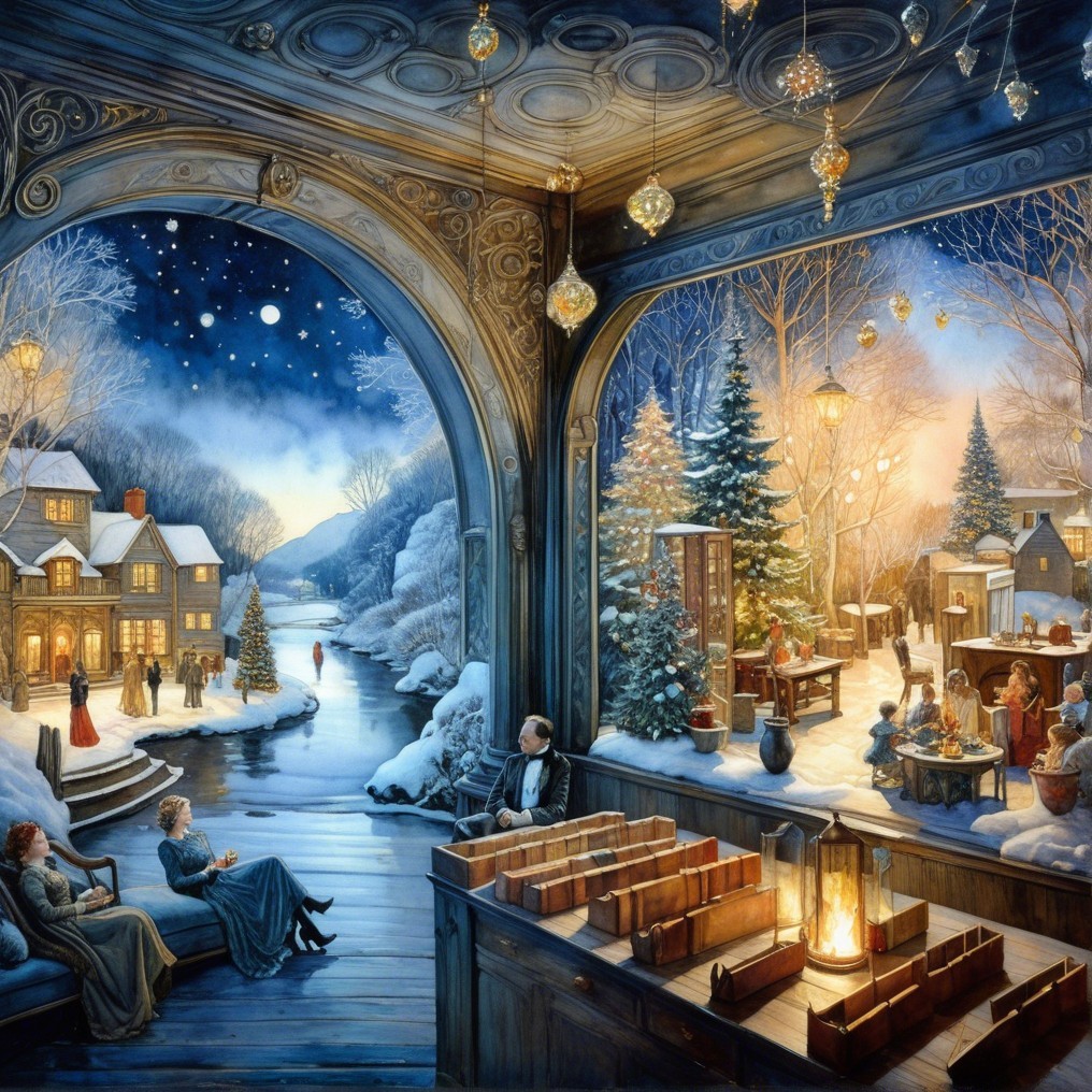 A cozy winter scene features a warmly lit room with a man enjoying a drink by a tree, while outside a snowy landscape glows under the moonlight, creating a tranquil holiday atmosphere.
