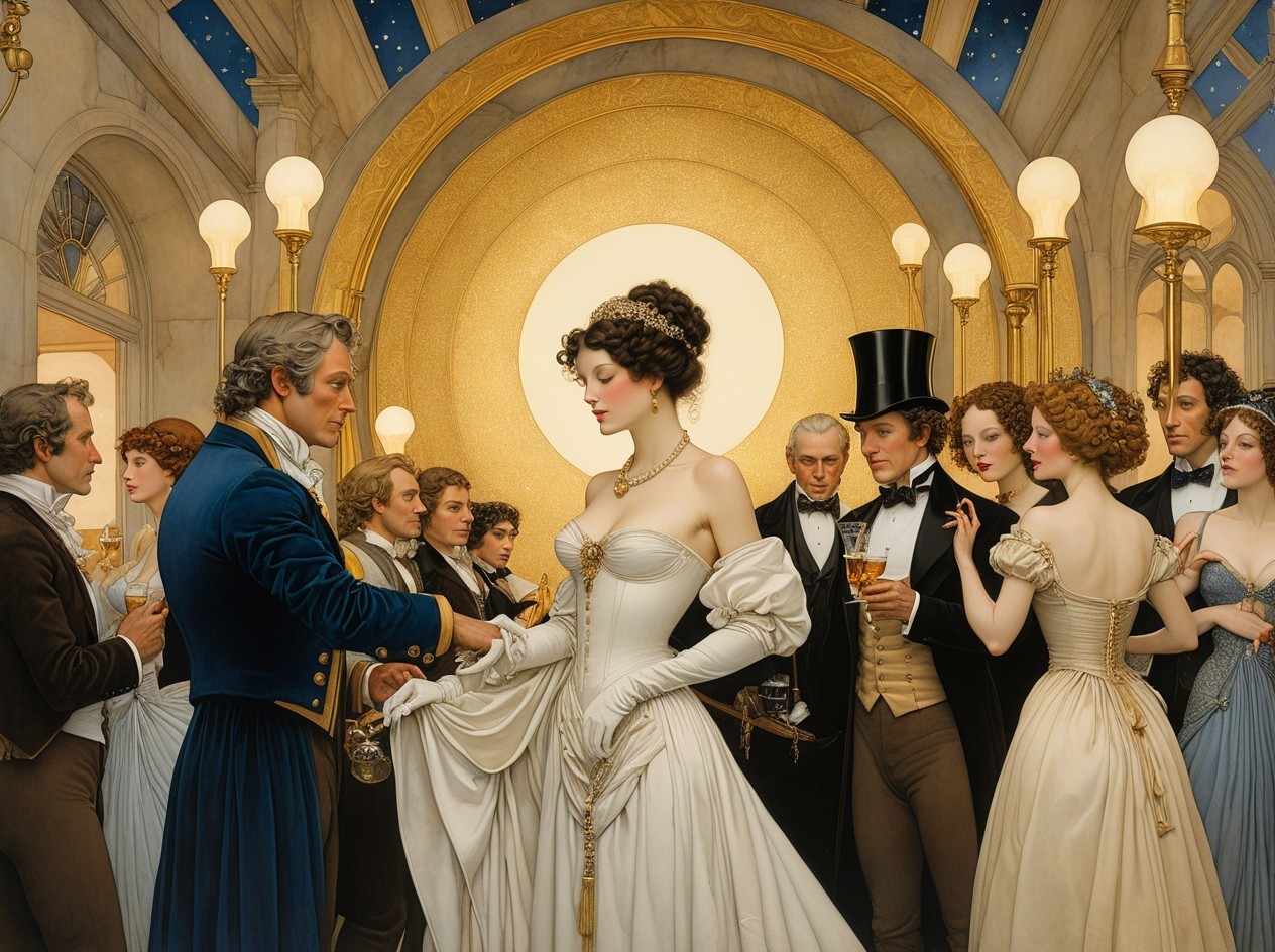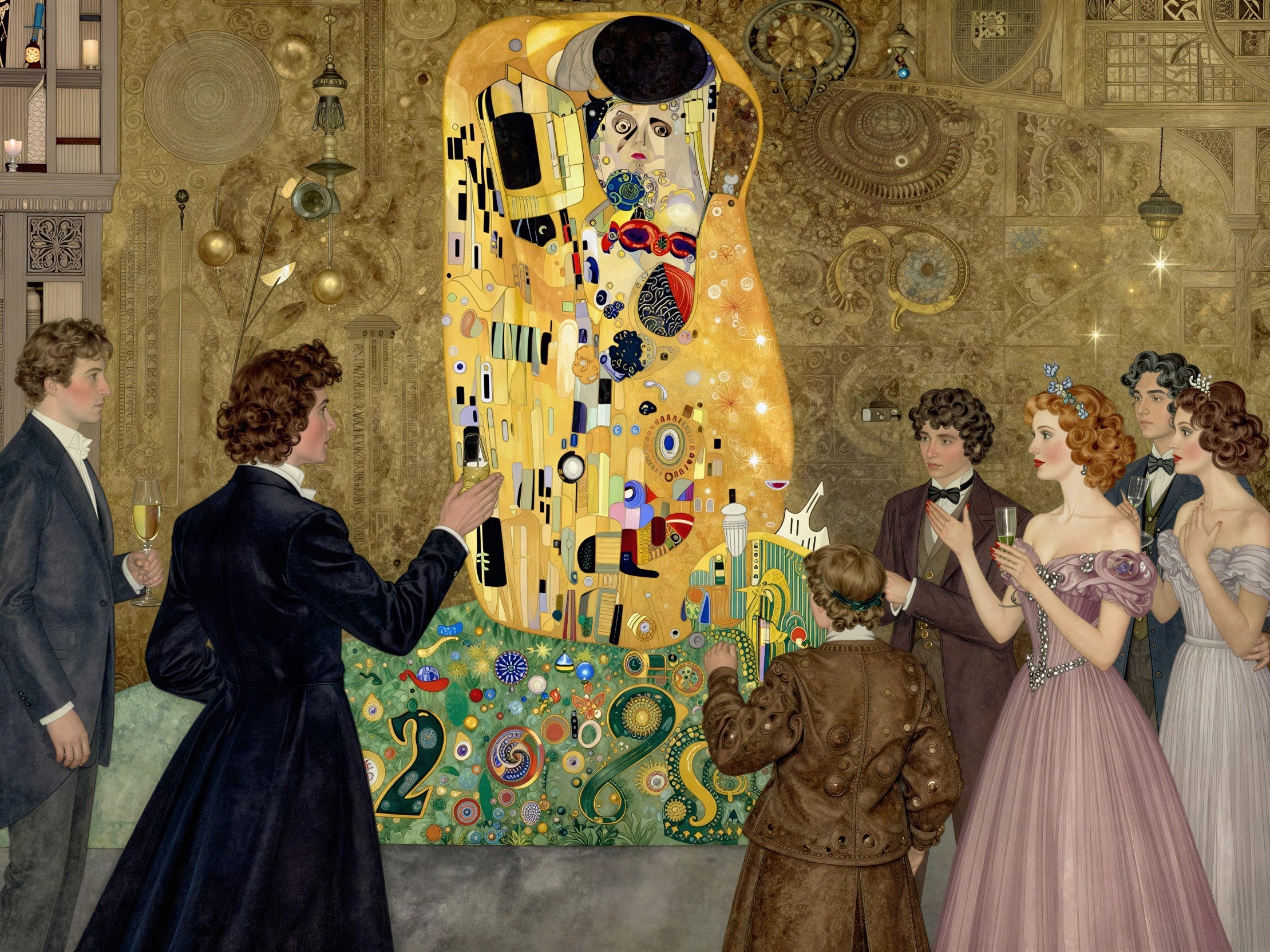 An Art Deco painting depicts nine stylized figures, three men and six women, arranged in a row in front of a golden geometric background of concentric and overlapping circles. The lighting emphasizes the figures, creating a spotlight effect.