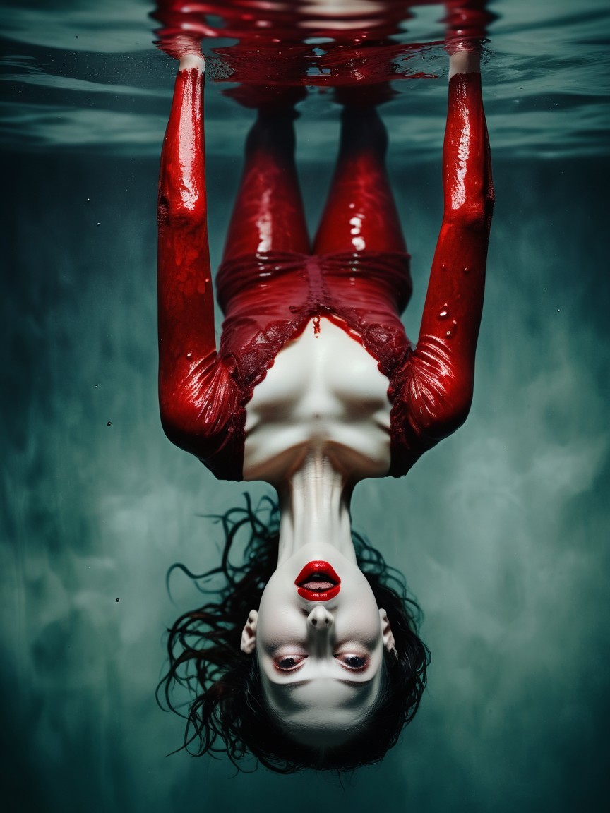 Prompt: "below the blood level under water, (Vulgar Infinite occult antichrist / wet-plate collodion photography cerography) Colorful inverse diapositive deepfake art of disturbingly terrifying Unique roughly fused three different personalities as one The Thing body, in antigravity art as open_wide_red_lips_grenade 0.000666 seconds after the explosion :: consume constructive cubist destruction {by Eric Lacombe & by Endre Penovac & by Charles Addams} [Infinite antichrist occult fusion of the style of Beksiński, Giger, deep colors, 16k resolution, frighteningly beautiful photorealism highly detailed, RAY TRACING, 3 point lighting]"