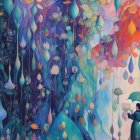 The artwork features ethereal figures with flowing hair surrounded by colorful, swirling patterns and luminous orbs. A figure with an umbrella stands below, harmonizing with the dreamlike scene.