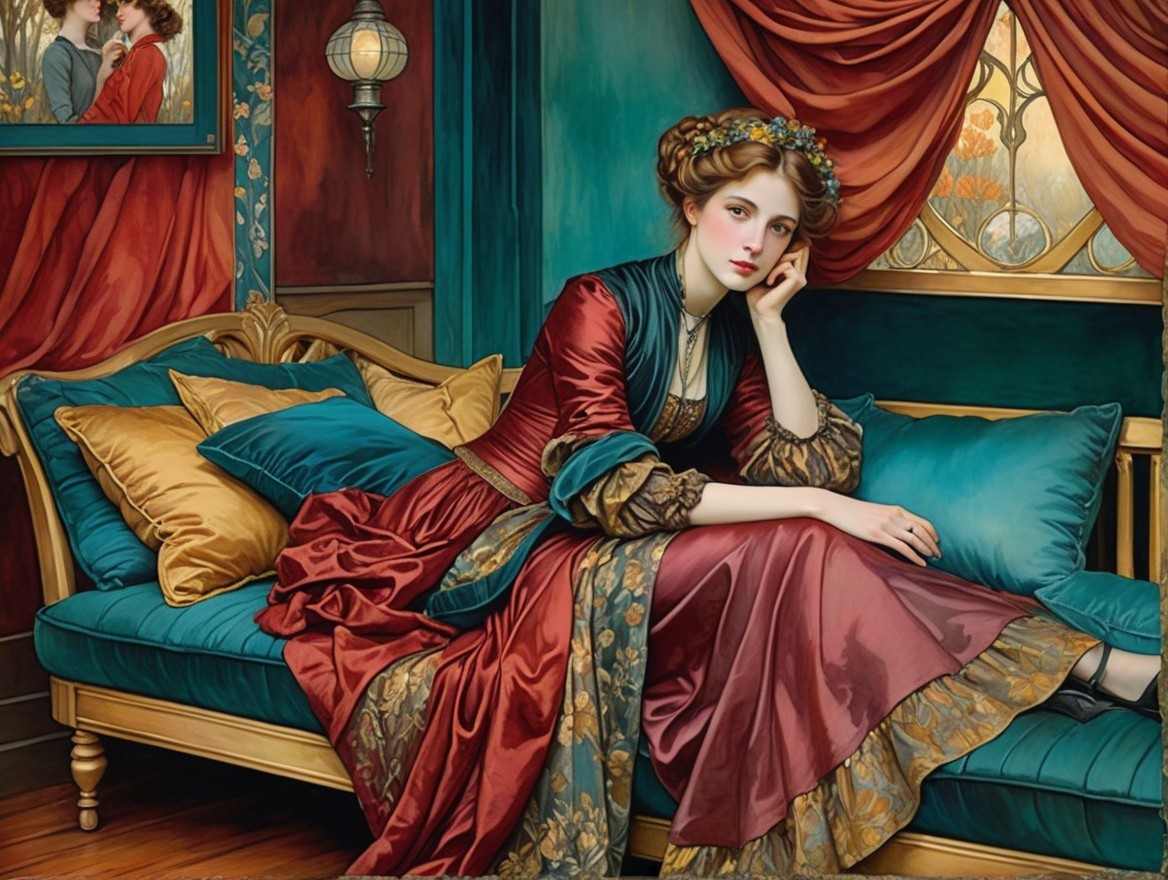 A young woman in a richly colored, vintage gown lounges on a teal sofa, gazing thoughtfully out a window adorned with autumn leaves. Warm tones create a cozy, nostalgic atmosphere.