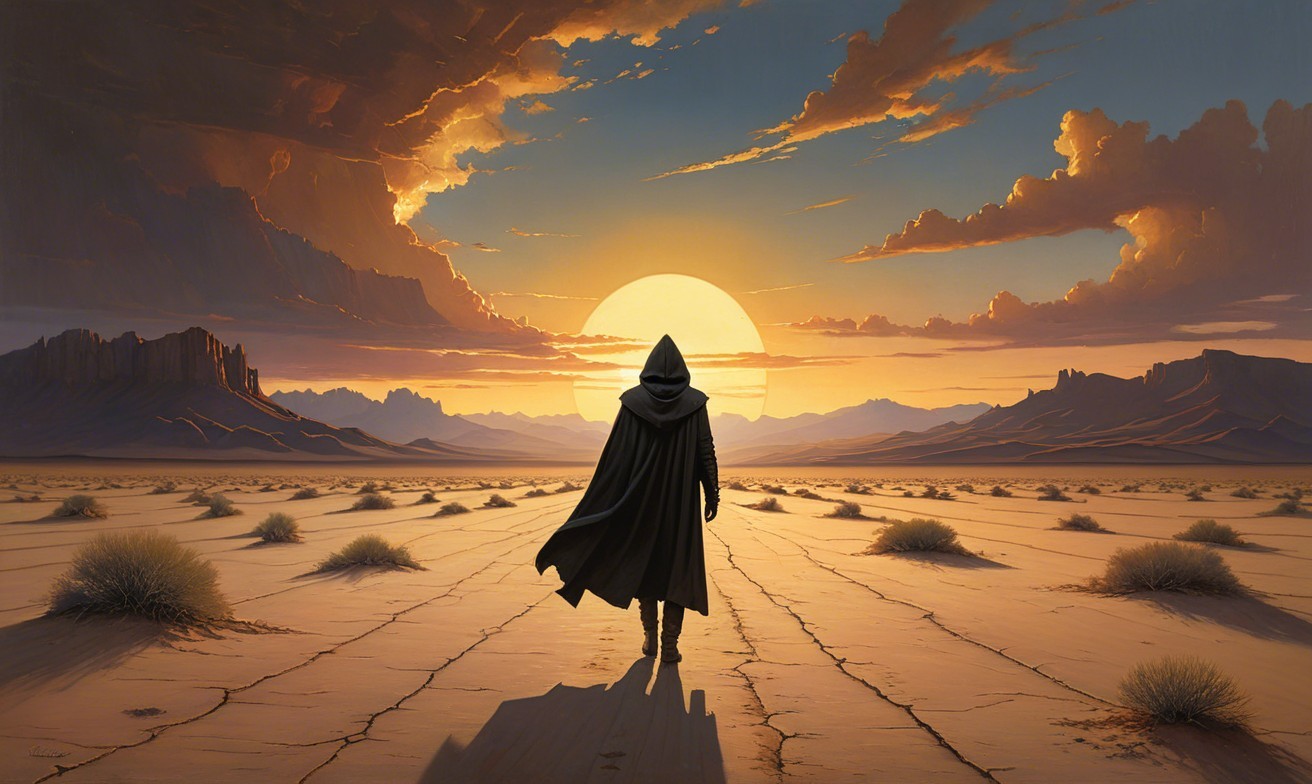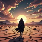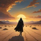 A cloaked figure stands in a barren desert, facing a vibrant sunset. The sky is filled with dramatic clouds, casting soft shadows on the cracked earth, evoking a sense of solitude and mystery.