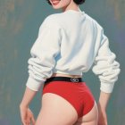 A half-body shot of Audrey Hepburn from behind, wearing a loose white long-sleeved top with baggy sleeves, and red high-waisted briefs. She has dark hair with short bangs across her forehead, neatly tied in a bun at the back. She is looking back over her shoulder,