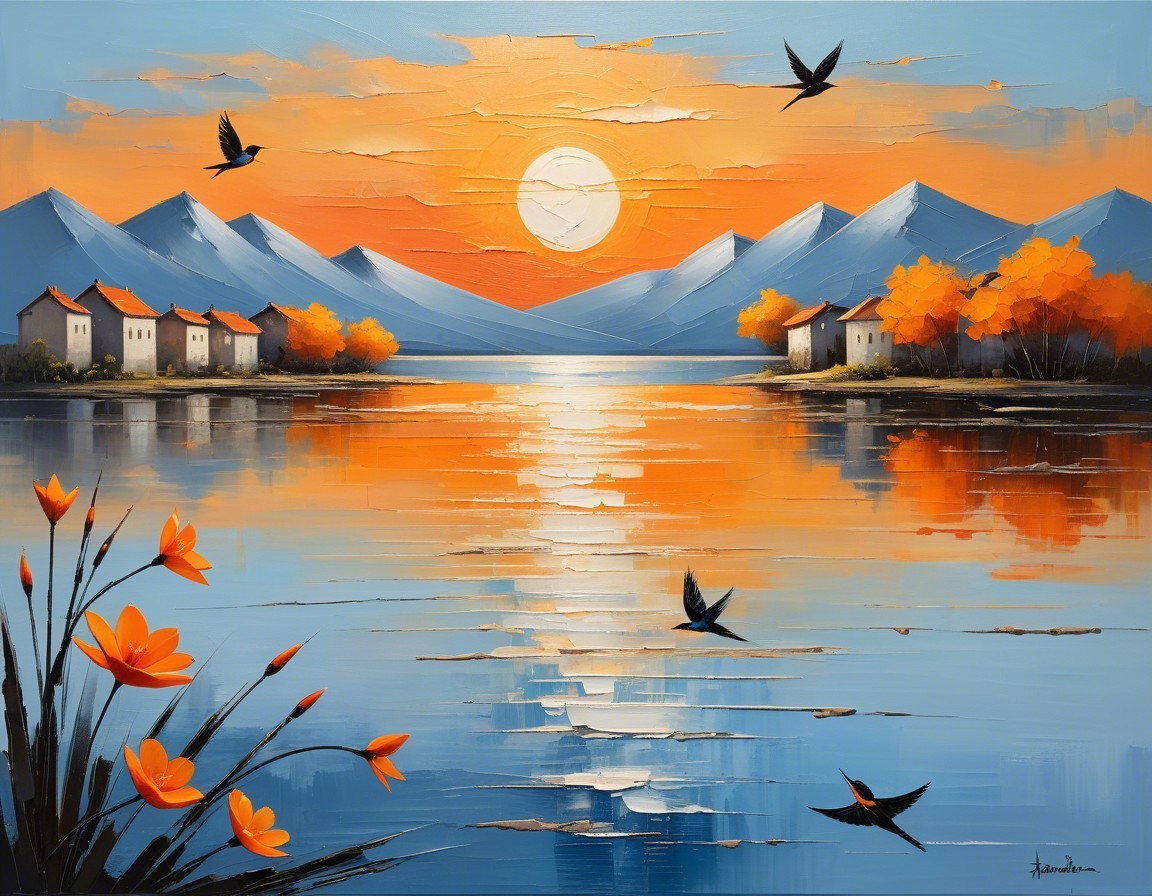 A serene landscape featuring a calm lake at sunset, reflecting vibrant orange hues. Snow-capped mountains frame the scene, with quaint houses and autumn trees adding charm. A bird soars above.
