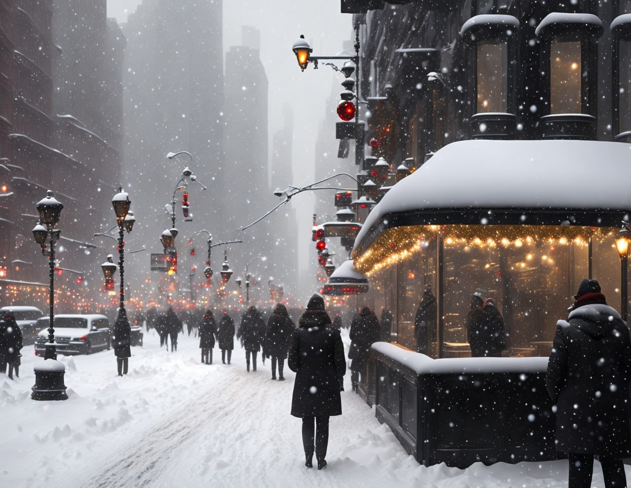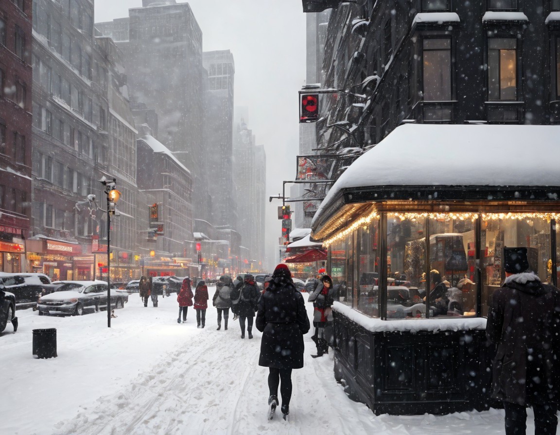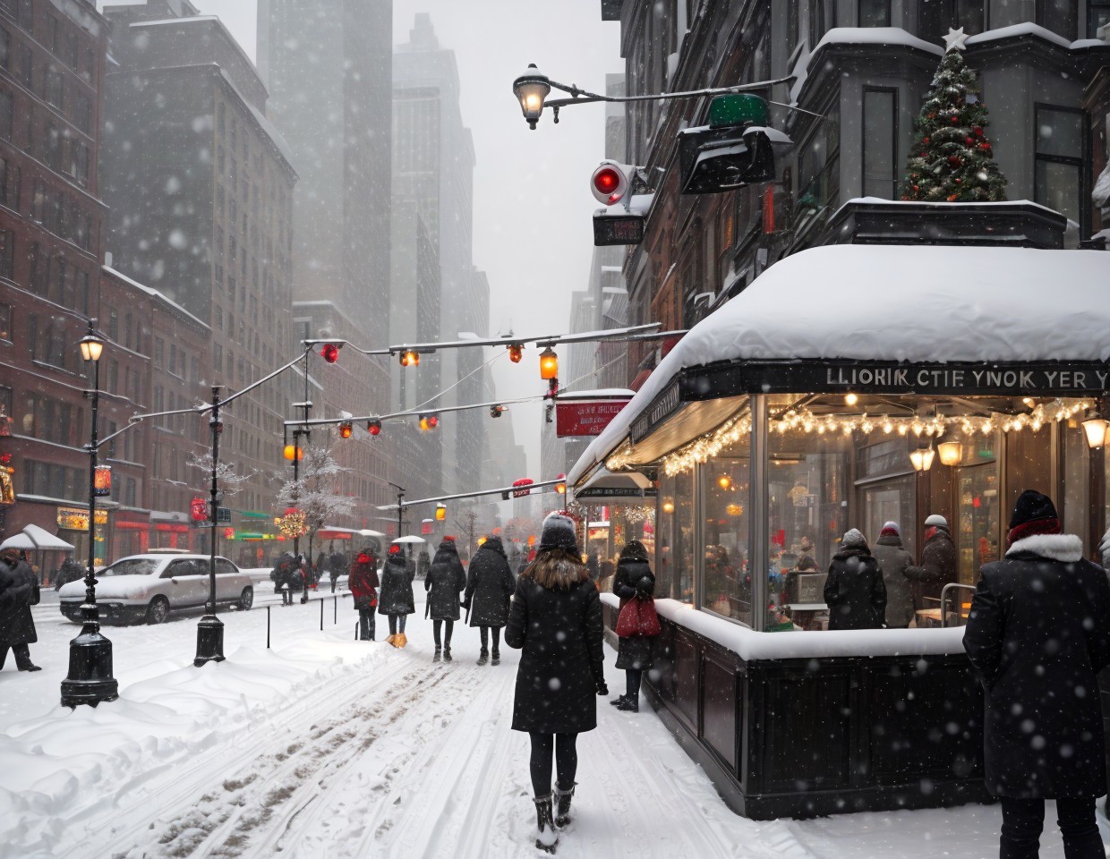 Prompt: "Decembre, Christmas time scene in deep - winter snowy, new york city at cloudy daytime, snowing, minimalist but with intricate details, uncanny atmosphere,"