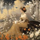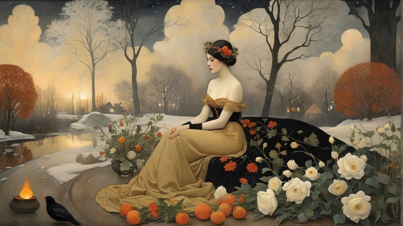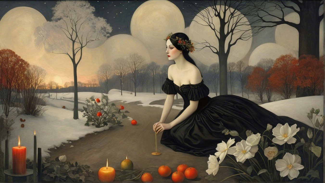 A haunting scene unfolds in a snowy landscape. A woman in a black gown kneels by a circular patch, surrounded by candles and pumpkins, under a twilight sky with two large moons.