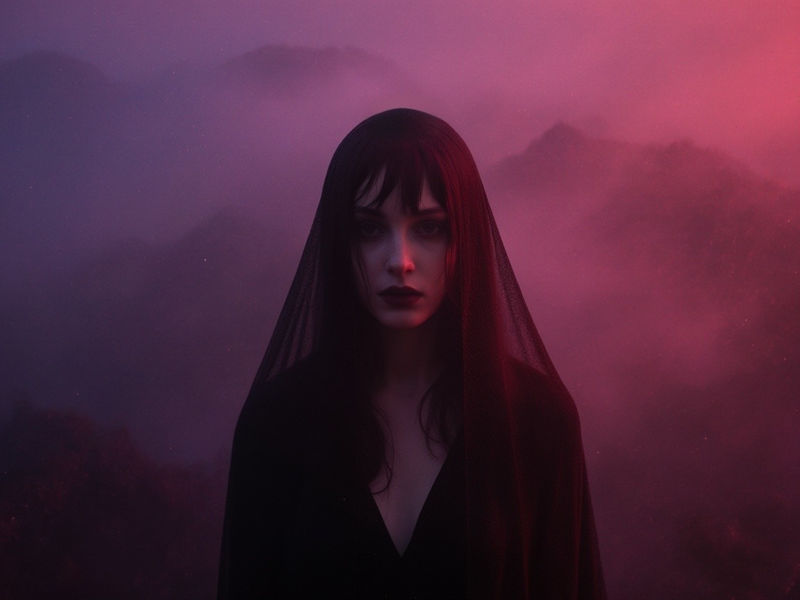 A mysterious figure shrouded in a black veil stands against a backdrop of swirling mist. The dim light creates a haunting atmosphere, highlighting her striking features and enigmatic presence.