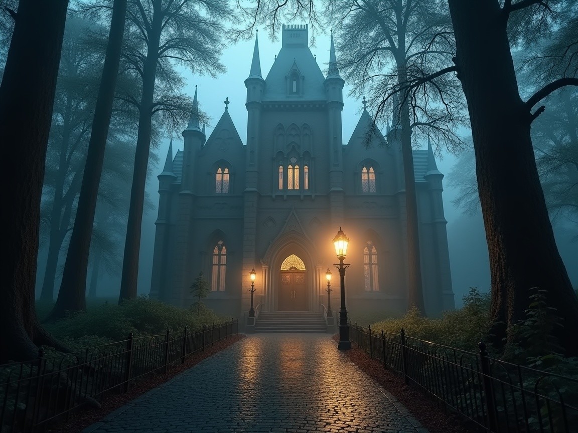 A gothic castle looms in a misty forest, illuminated by warm lanterns. Towering trees surround the scene, creating an eerie yet enchanting atmosphere under a soft, foggy twilight.