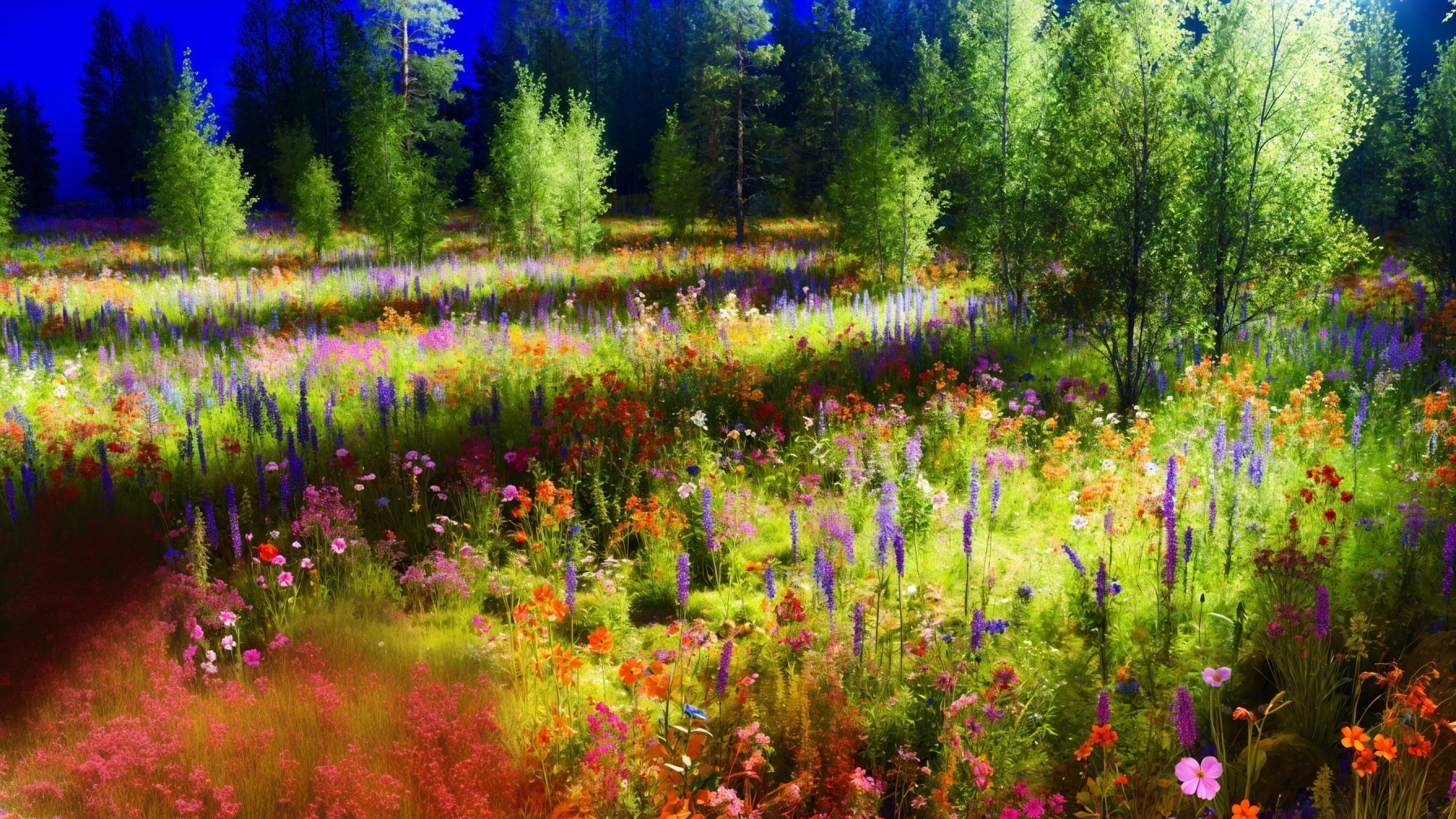 A vibrant meadow bursts with colorful wildflowers under a clear blue sky. Lush green trees frame the scene, creating a serene and picturesque landscape that evokes a sense of peace and beauty.