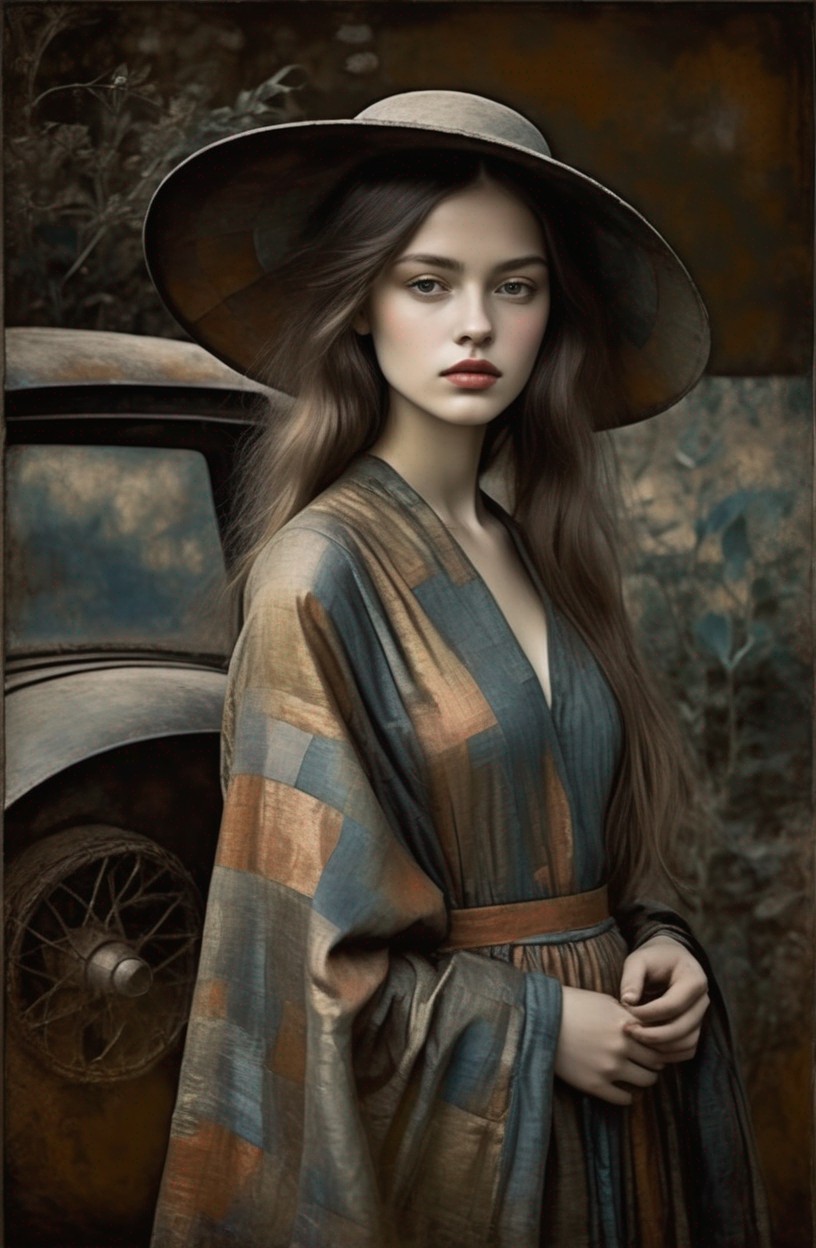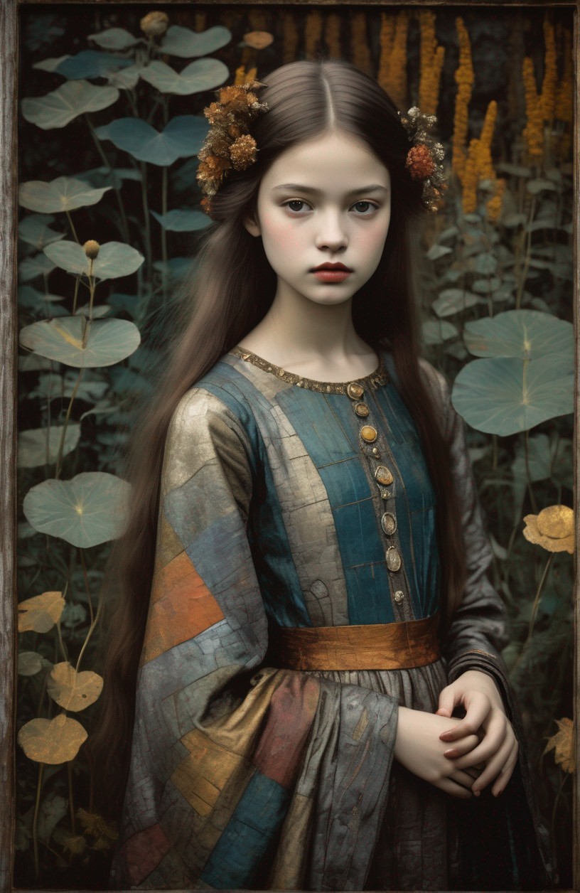 Woman portrait with pale skin, dark wavy hair, vintage dress, surrounded by green foliage and orange