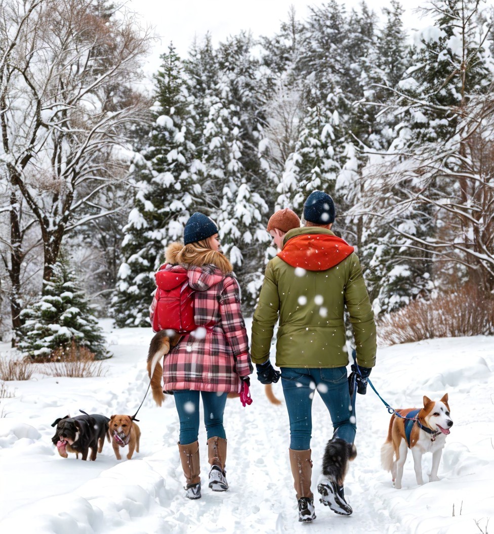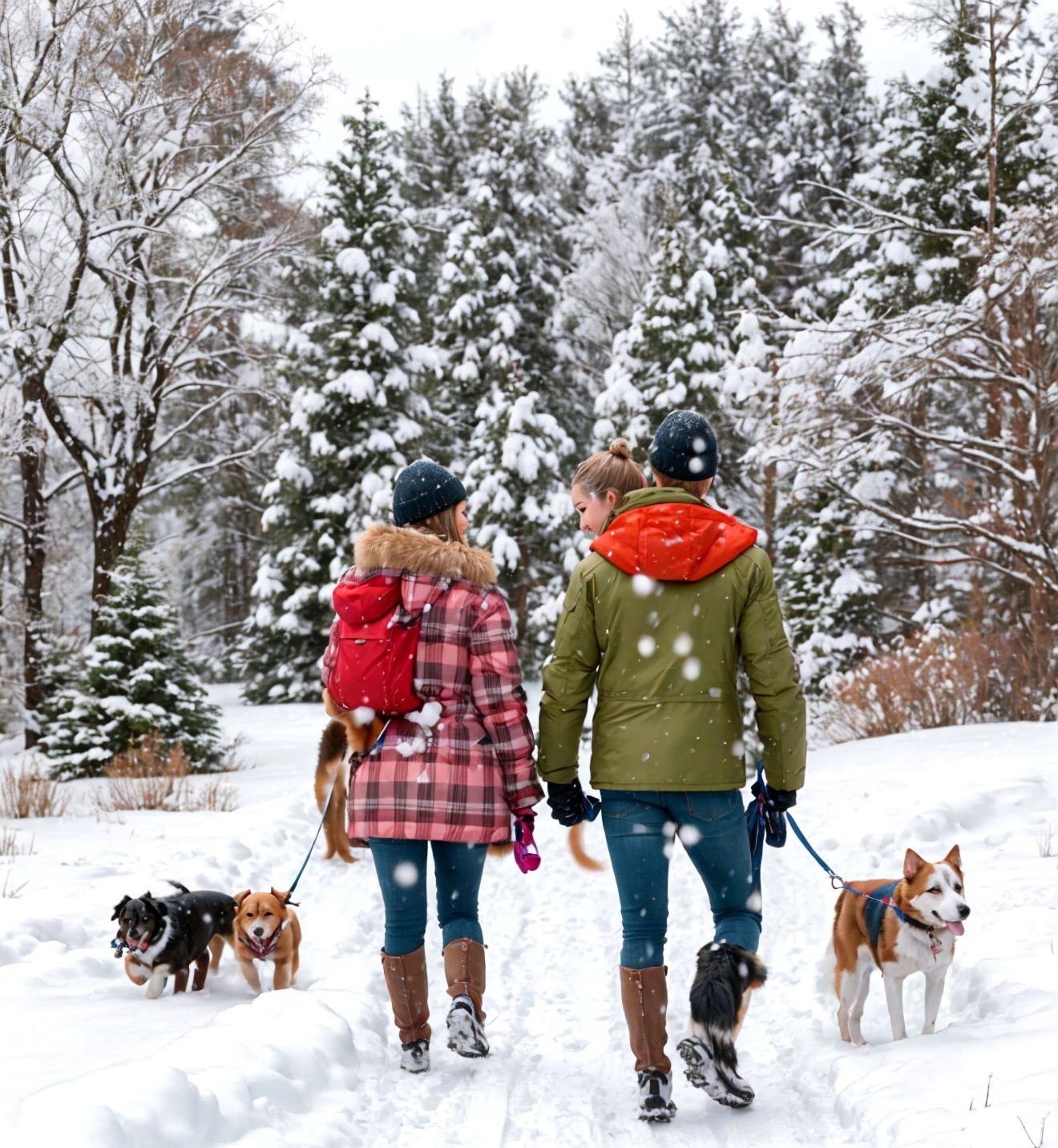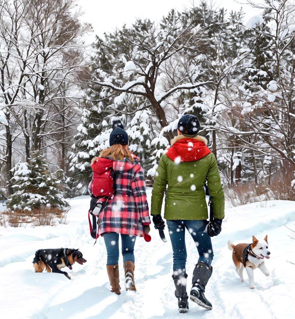 Two people walking with dogs in a snowy forest, holding hands, dogs wearing coats, snow-covered trees in the background.