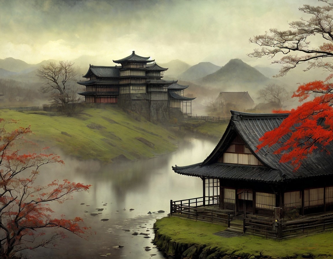 Oppressive rural landscape, early 20th century, Japan, by Liu Maoshan and John Atkinson Grimshaw, late autumn, watercolor, wet brush effect, intricate, epic, panoramic wide view