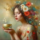 A serene woman with flowing hair adorned with vibrant flowers holds a golden cup, set against a mystical backdrop of a castle shrouded in mist and colorful hues.