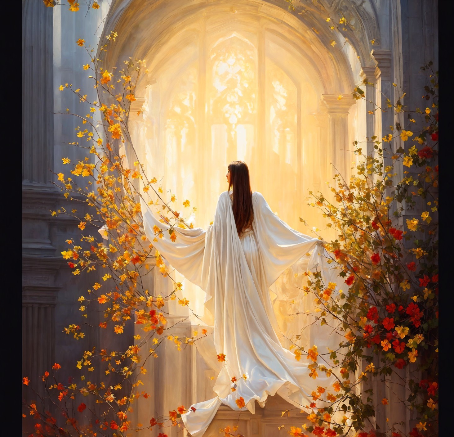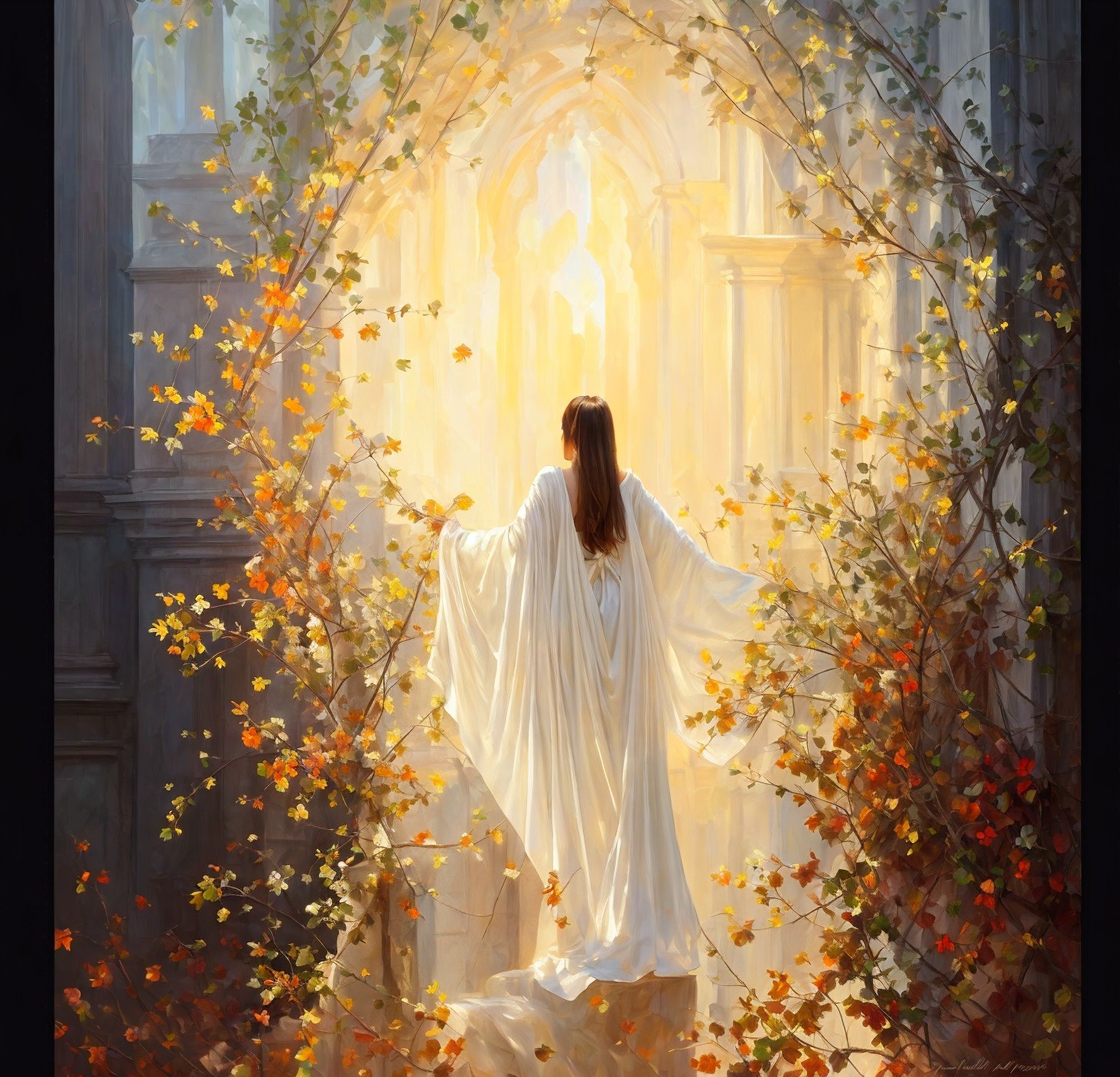 Woman in white gown surrounded by autumn leaves near Gothic arch in warm sunlight