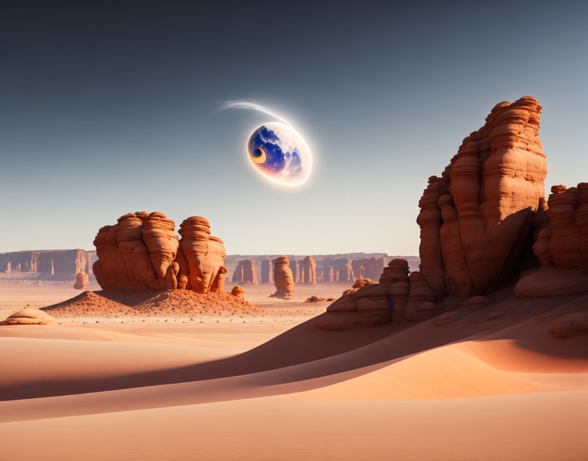 A surreal desert landscape with rocky formations and a large, fantastical moon looming in a clear sky.