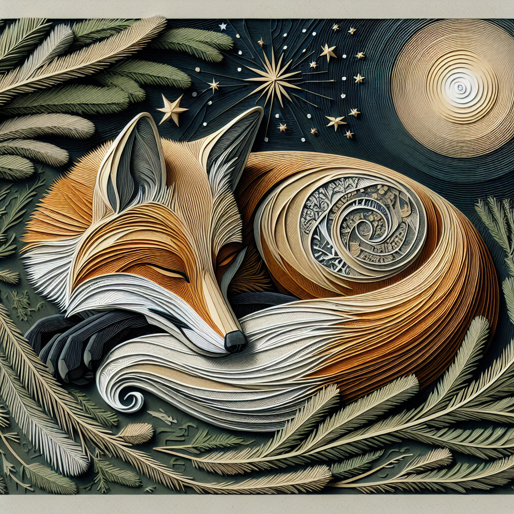 Prompt: "A single image, multi-media collage; a fox sleeping with his nose tucked into his curled tail; he is nested in spruce pine needles with a starry sky overhead"
