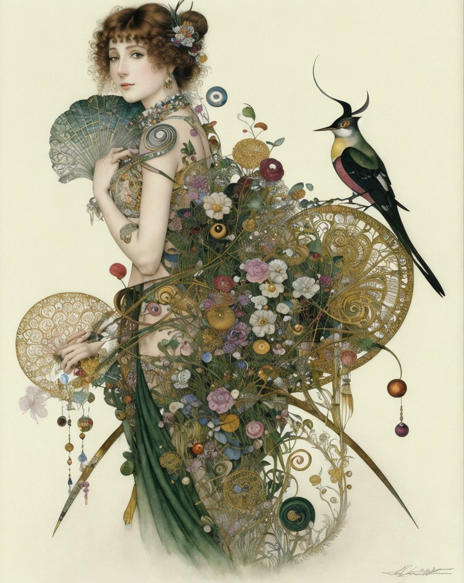 The image features a graceful woman with flowing hair adorned with intricate floral and butterfly motifs, creating a blend of elegance and fantasy under soft, ethereal lighting.