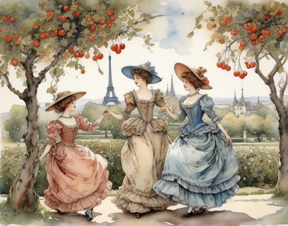 Three women in elegant vintage dresses and hats stroll under a tree with ripe fruits in a serene, aristocratic garden setting.