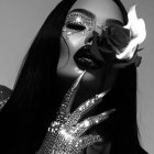 A glamorous figure features shimmering makeup with glitter accents, holding a pink lollipop. The striking lip color and sparkly nails enhance the bold, fashion-forward look against a dark backdrop.