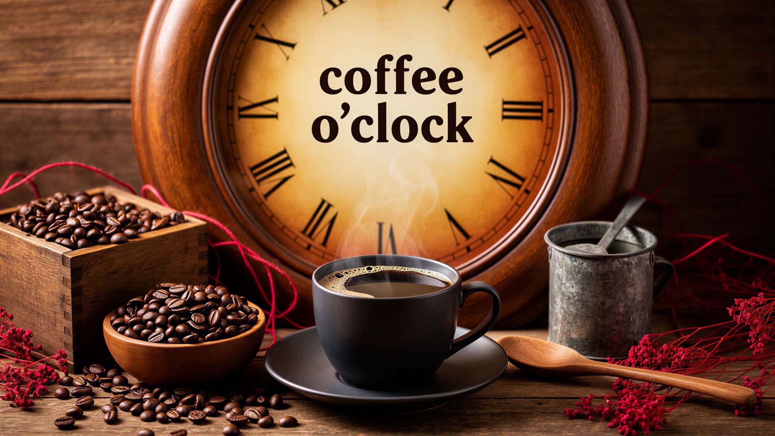 Morning hot beverage on a wooden table, steam coming out from a coffee mug in the center of the image, the words "coffee o'clock" are written on a clock in the back, the clock has roman numbers and wooden frame, to the left of the image is a wooden box full of