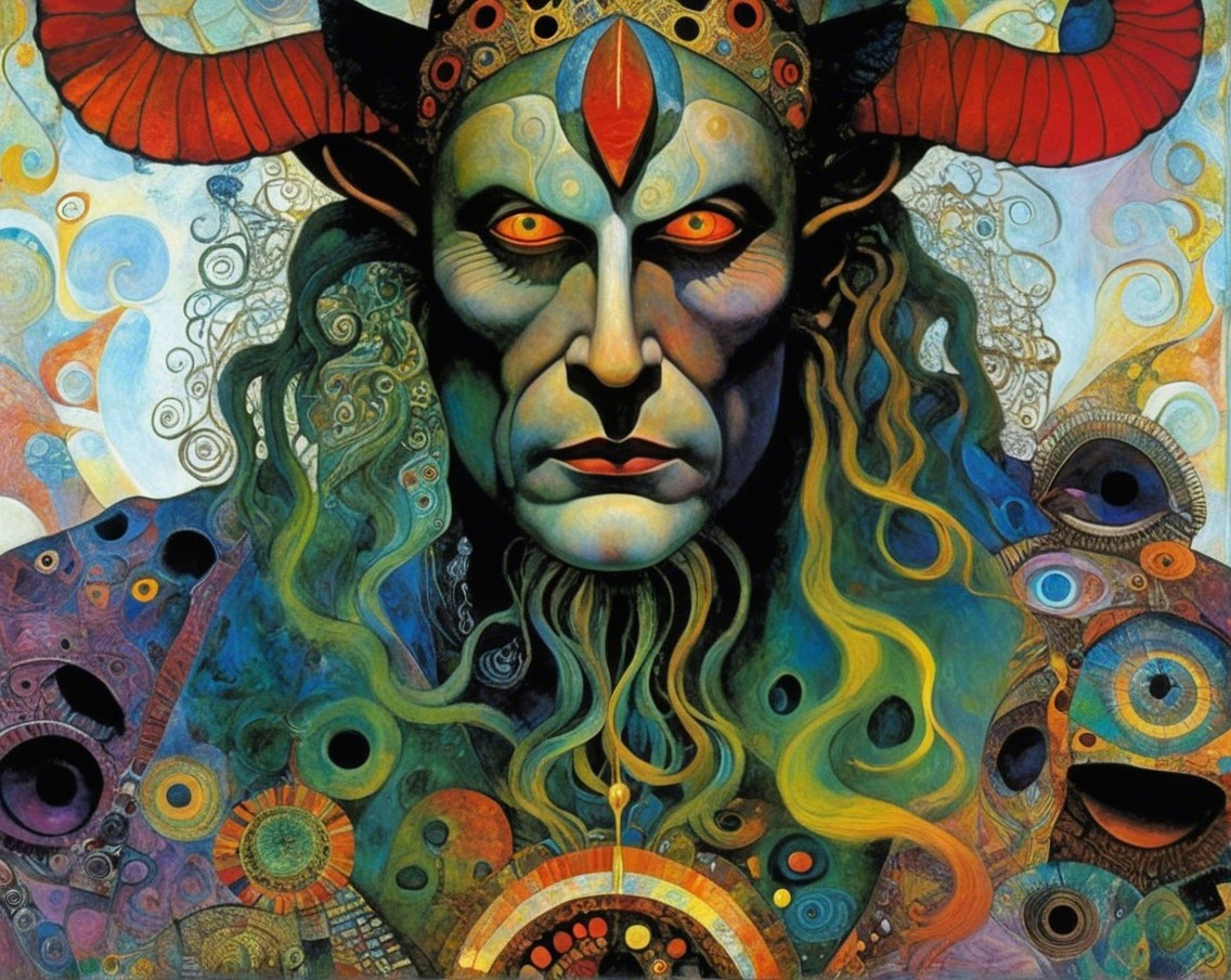 A mystical figure with striking facial features, adorned with elaborate horns and a colorful crown. Swirls of vibrant colors and intricate patterns surround the character, creating an otherworldly atmosphere.