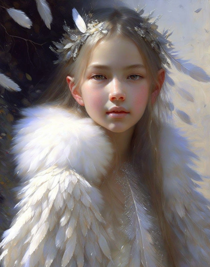 Ethereal digital art portrait of a woman in feathered attire and icy crown