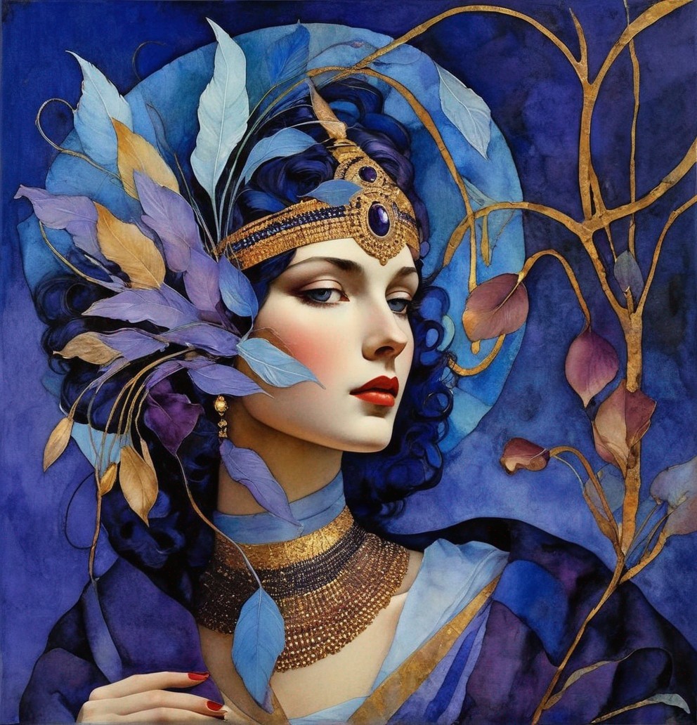 whimsical, beautiful, poignant, touching. colors violet, gold, rust, indigo, burgundy, black. soft watercolor extra water in Art Deco by Annigoni, Egon Schiele, Milo Manara, Botticelli, Catrin Welz-Stein, Jean Metzinger, Klimt, perfect eyes, perfect hands face , highly detailed, complementary colors, hyper detailed. Watercolor and ink splatter, dynamic pose,