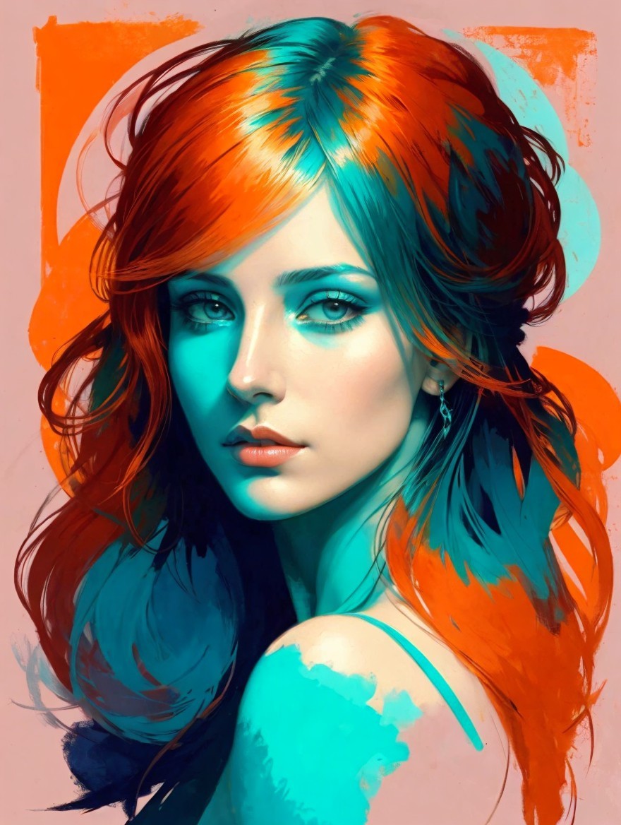 The image features a striking portrait of a young woman with vibrant red and teal hair. She has captivating blue eyes and a soft expression, set against a stylized background.