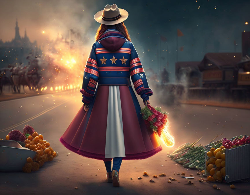 Fashionable individual in long coat in dimly lit alley with lanterns and second person.
