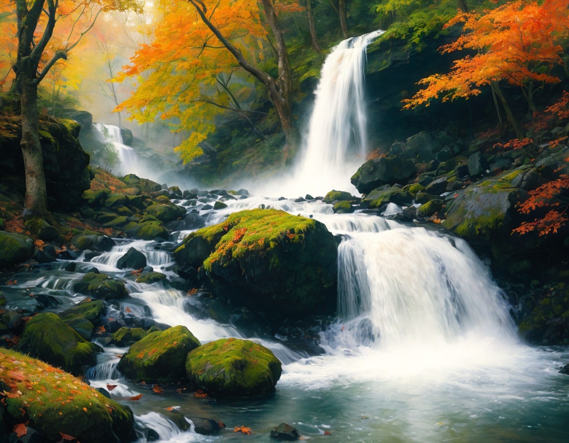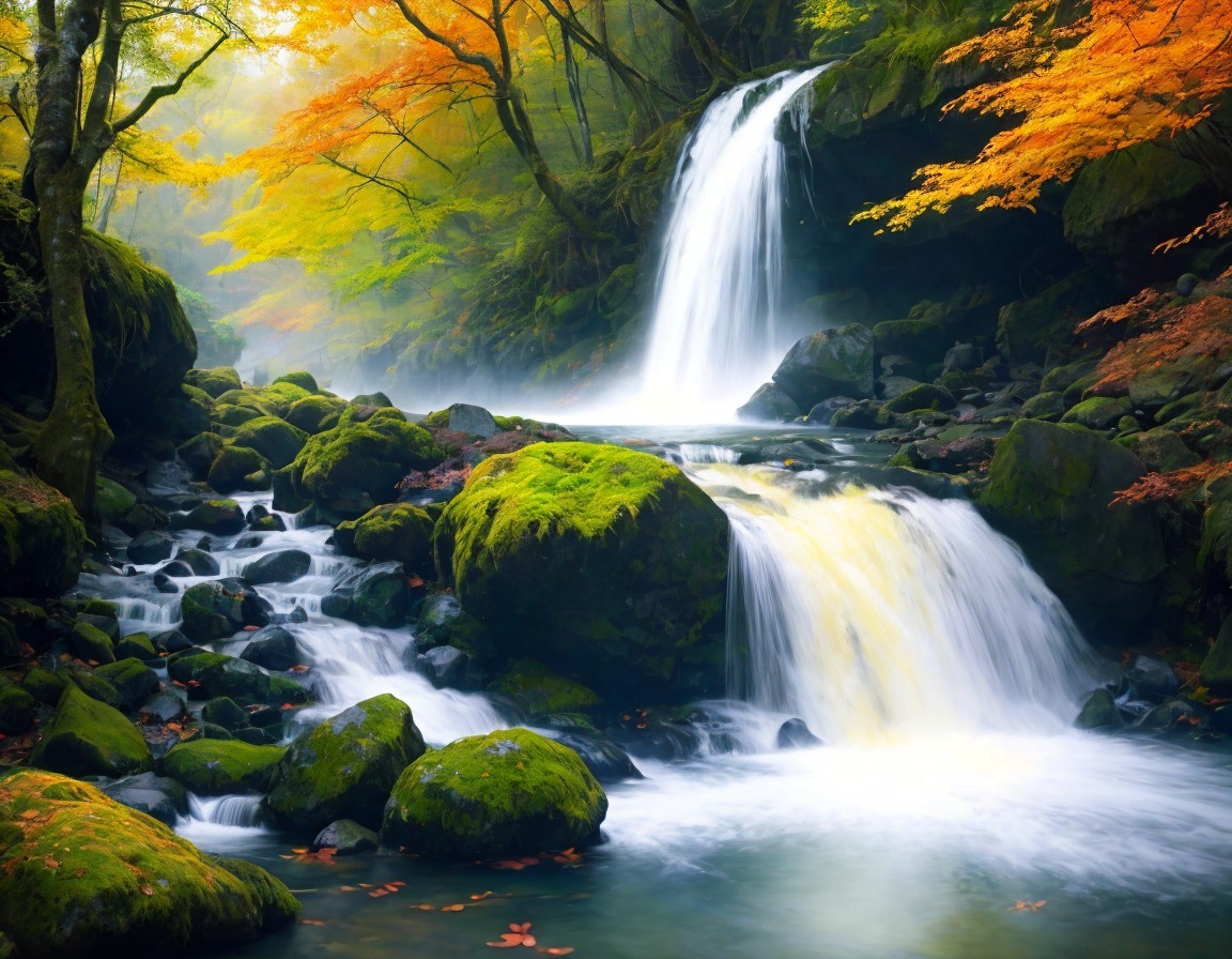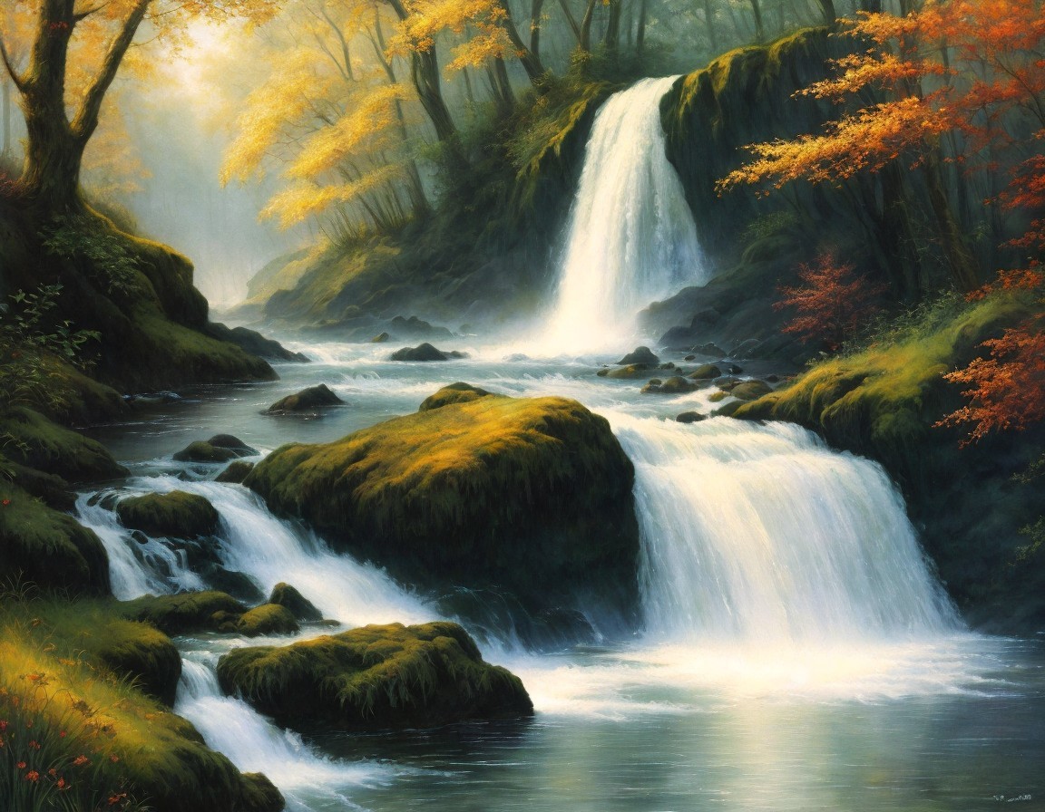 A vibrant landscape featuring a serene waterfall cascading over rocky formations, surrounded by lush greenery and golden autumn foliage, creating a tranquil and picturesque scene.