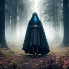 A figure in a dark cloak stands in a misty forest, surrounded by tall trees. They hold a glowing blue object, creating an eerie yet mystical atmosphere amidst the fog and foliage.