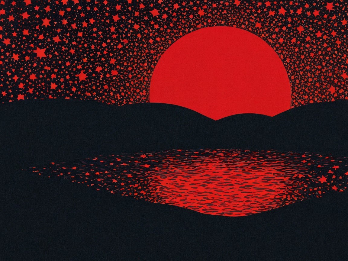 A vivid scene features a large red sun setting behind dark hills, casting a shimmering reflection on a tranquil lake. The sky is alive with bright stars, creating a dramatic contrast.