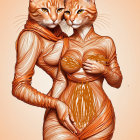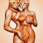 Two humanoid figures with feline heads resembling orange tabby cats, wearing skin-tight outfits that mimic their fur patterns, stand together against a soft, warm background.