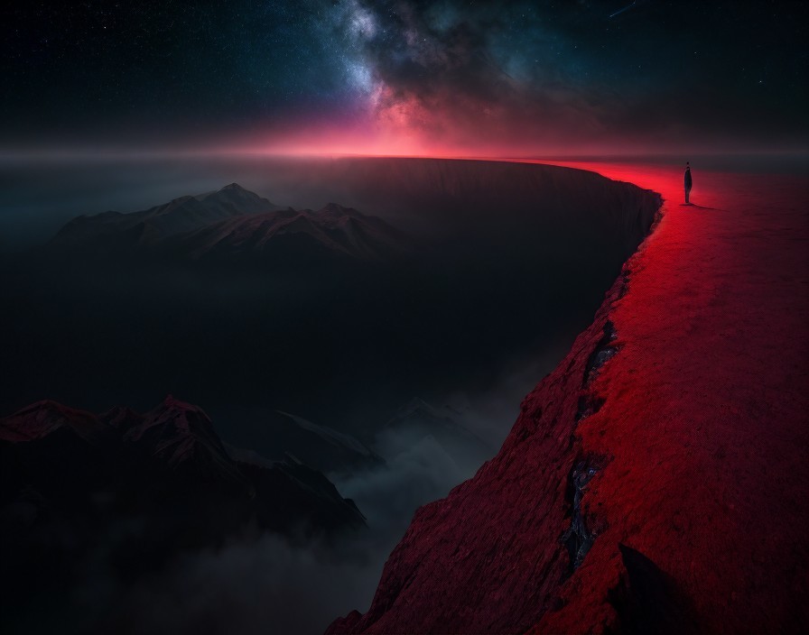 (Try it from Don Nash) - A person stands on a mountain edge under a starry sky with red illumination and misty valleys below.